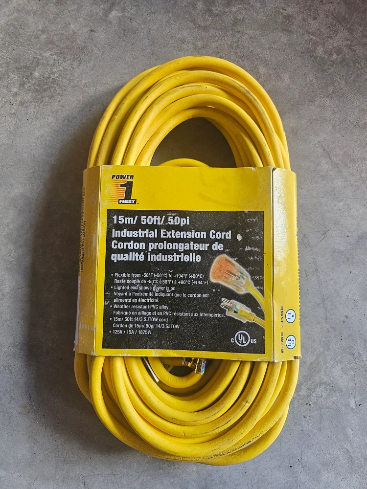 Selling a Power First industrial extension cord. It's 15 meters (50 feet) long and is made with weather-resistant PVC alloy. The cord is flexible from -58°F (-50°C) to +194°F (+90°C). The lighted end shows when the power is on. It's a 14/3 SJTOW cord and is rated for 125V/15A/1875W. New never used.