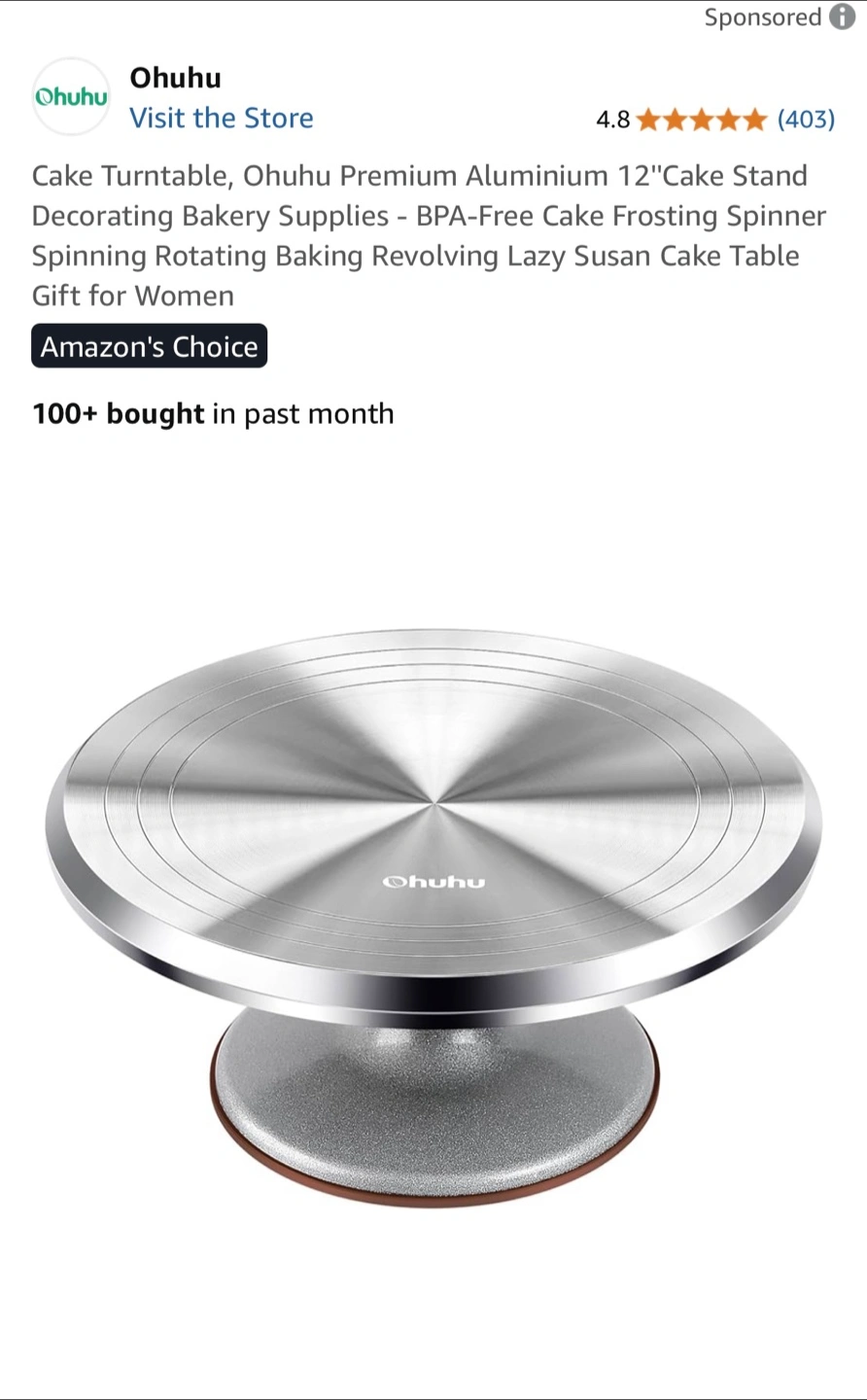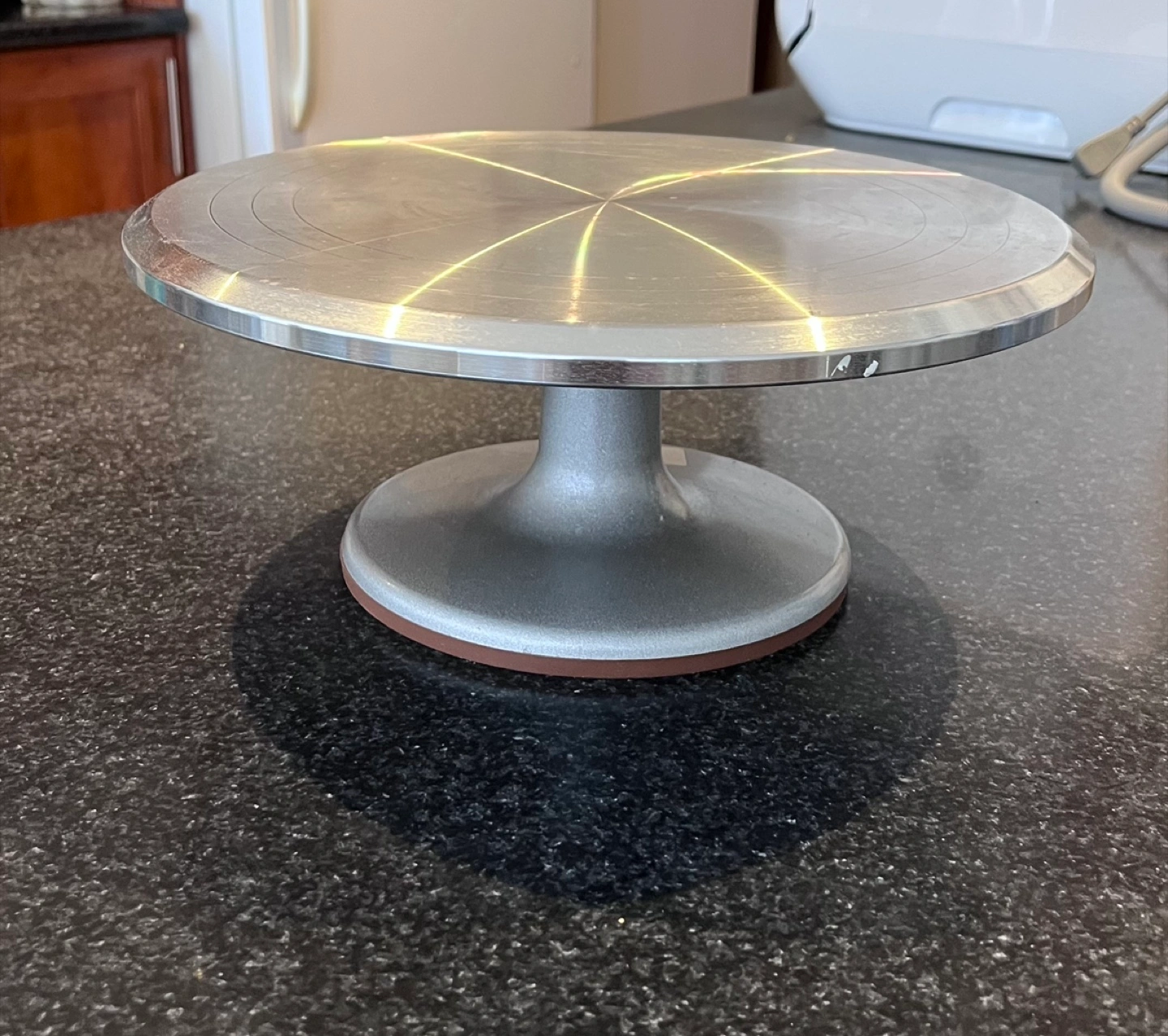 Gently used cake decorating turntable. It's a 12-inch premium aluminum cake frosting spinner and rotating baking stand. Perfect for decorating cakes and other treats!