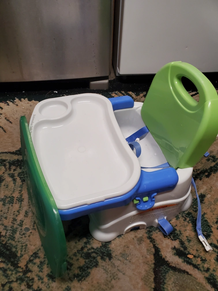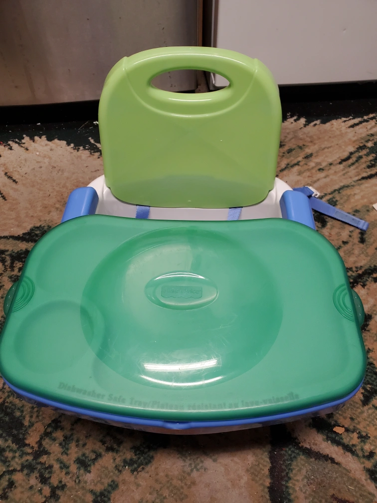 Selling a Fisher-Price Booster Seat! It's in good condition and ready for a new home. The seat is white, blue, and green. It's designed to be easy to clean, with a dishwasher-safe tray. Perfect for meal times with your little one!