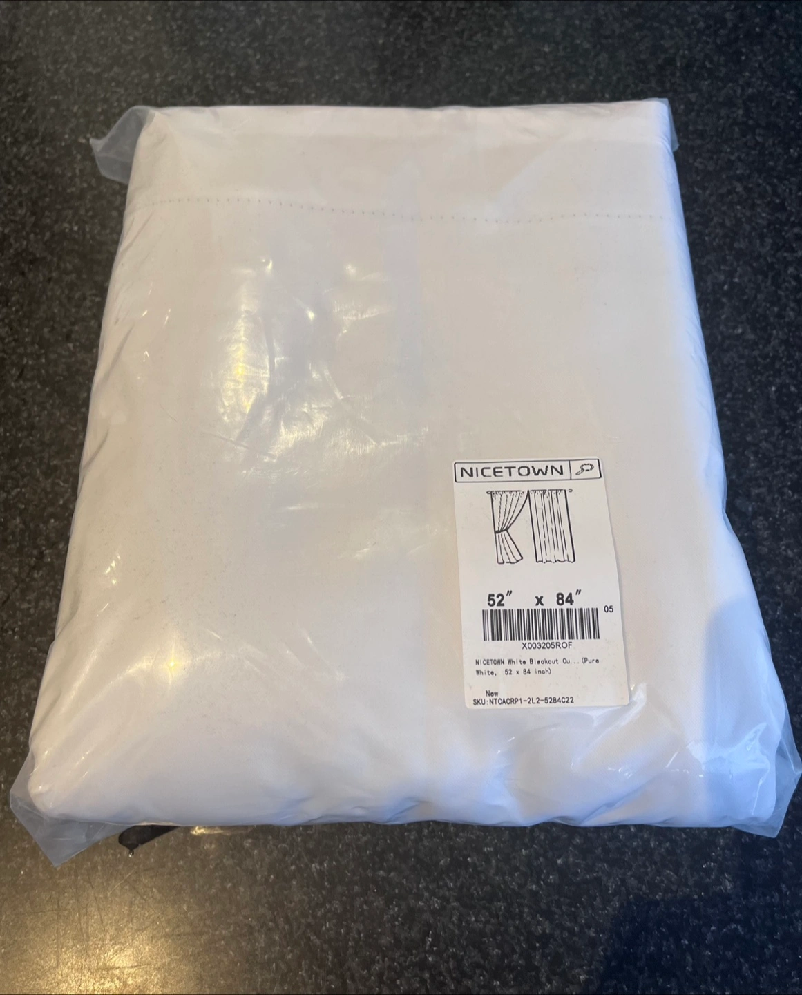 Brand new set of blackout curtains! They're pure white and measure 52 x 84 inches (2 panels). These curtains are perfect for creating a dark and cozy atmosphere in your bedroom or living room. They come in their original packaging!