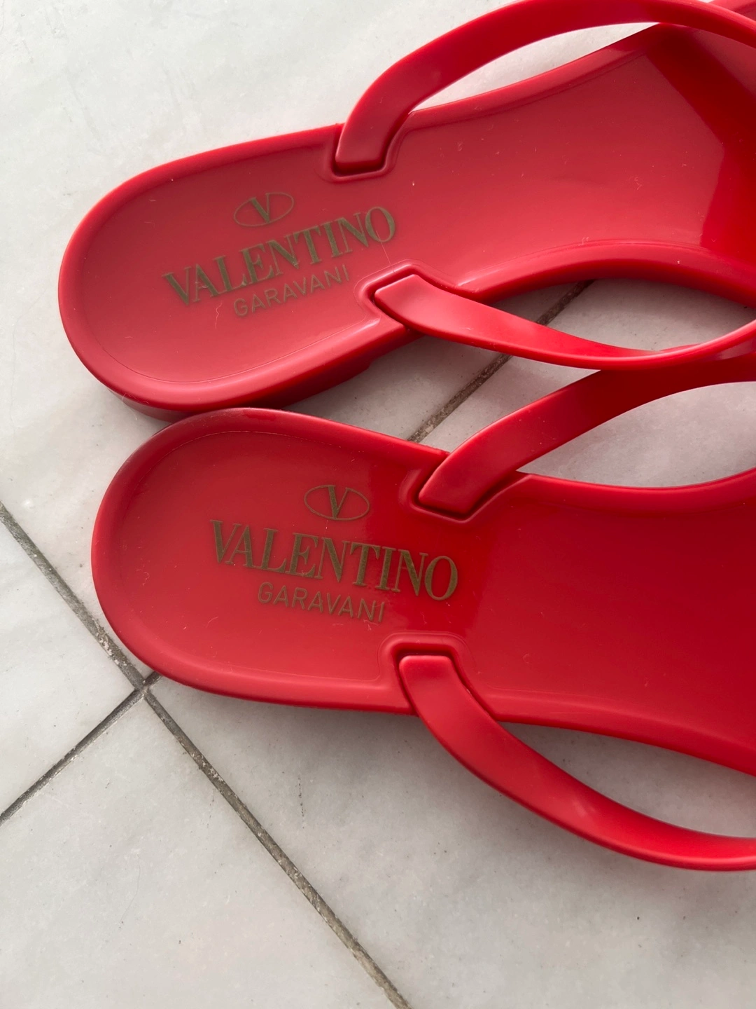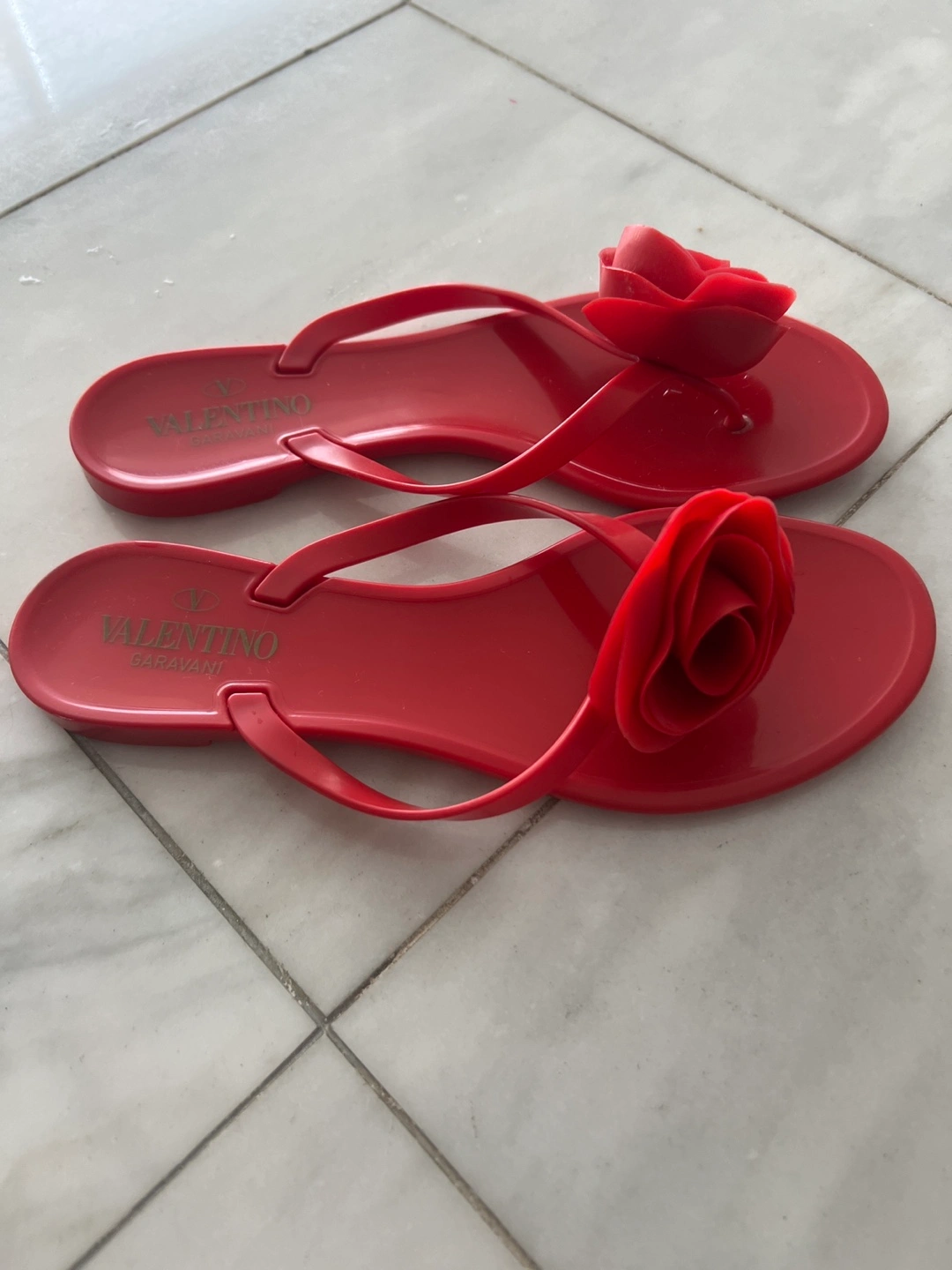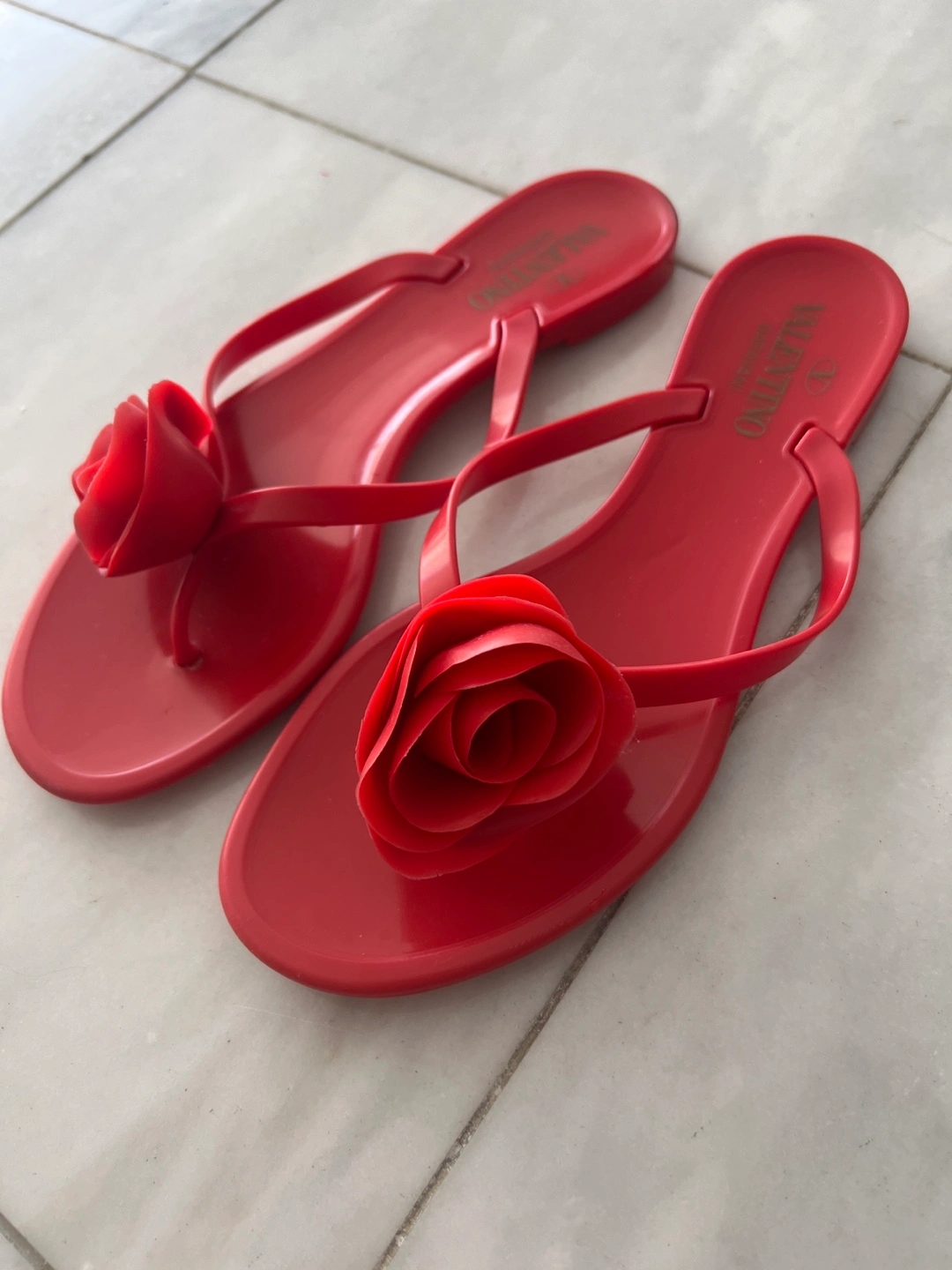 Selling a pair of Valentino Garavani flip flops in red! They feature a cute flower detail. Perfect for adding a pop of colour to your summer outfits