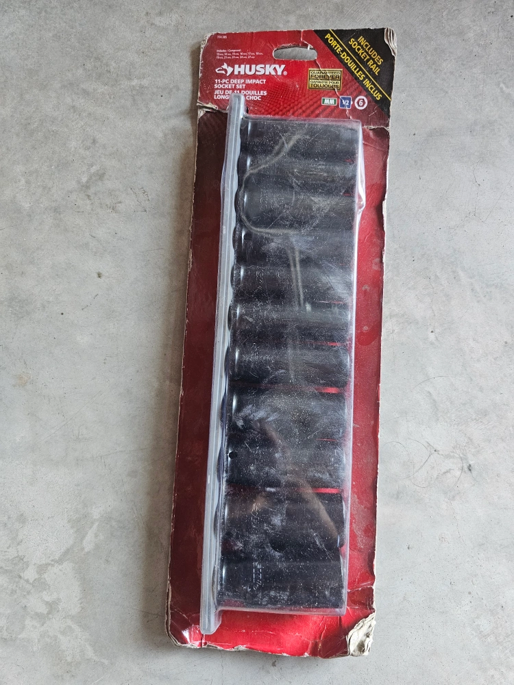 Selling a Husky 11-piece deep impact socket set! It includes a socket rail for easy organization. The set includes sizes 10 mm, 12 mm, 13 mm, 14 mm, 15 mm, 16 mm, 17 mm, 18 mm, 19 mm, 21 mm, 22 mm, 24 mm, and 27 mm. Never used in original packaging.