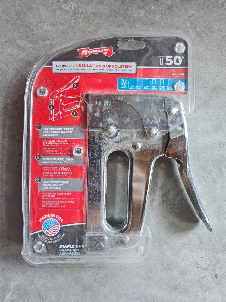 Selling an Arrow T50 staple gun, perfect for insulation and upholstery projects! It features hardened steel working parts for long-lasting use, a contoured grip for comfortable handling, and a jam-resistant mechanism. Made in the USA, this staple gun is ready to help you tackle your next project. Never used, Never opened in original packaging.