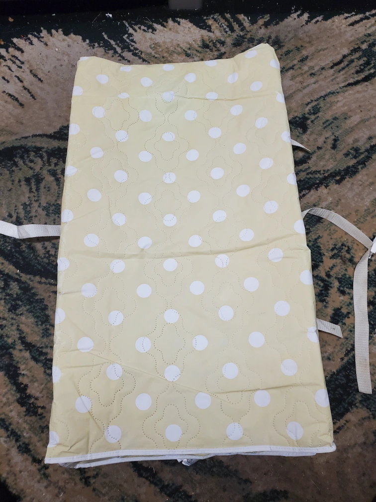 Selling a baby changing pad in a light yellow colour with white polka dots. It has straps to secure it to the changing table. Great for keeping your little one comfy during diaper changes!