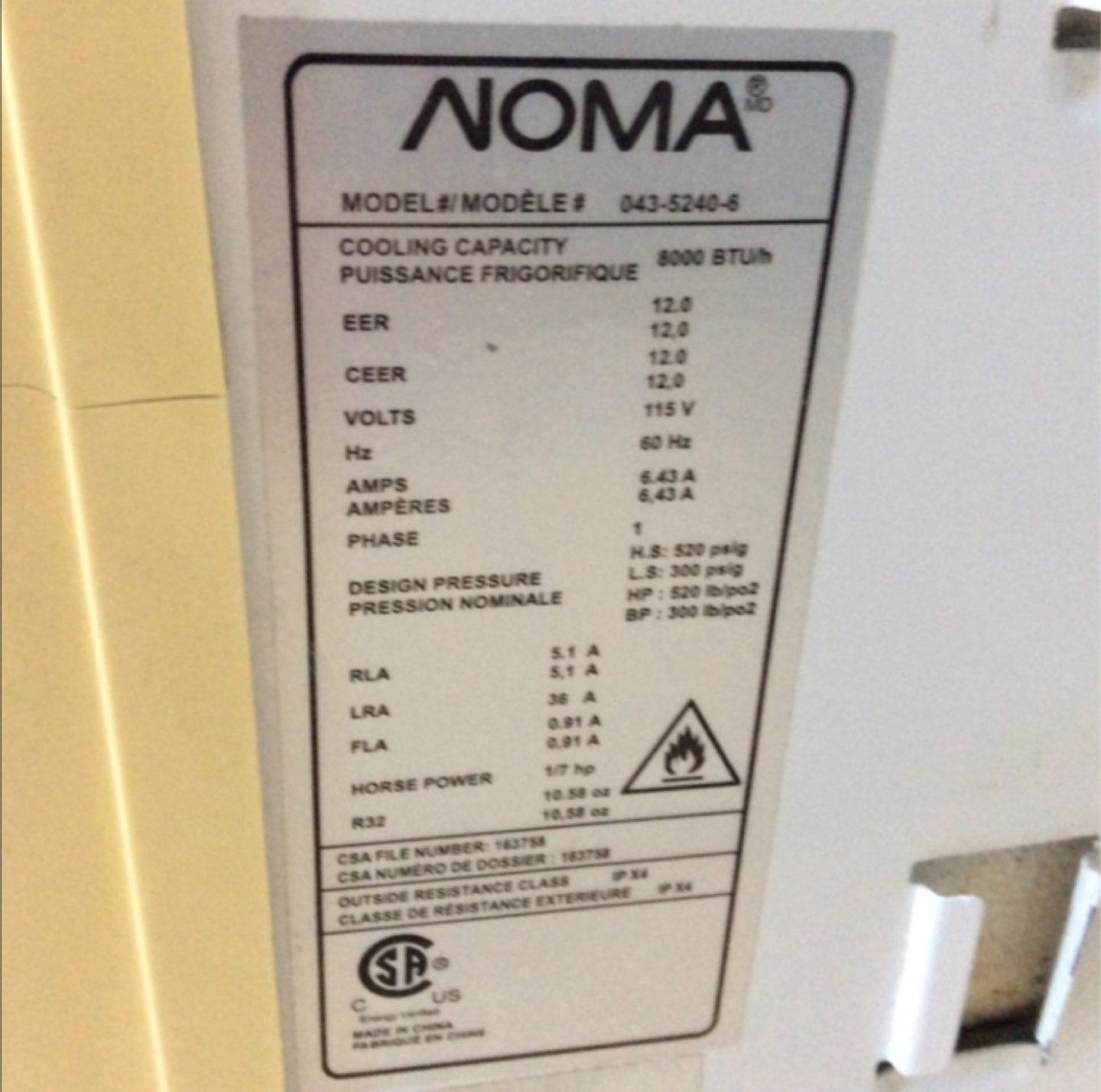 Selling a NOMA window air conditioner. It has a cooling capacity of 8000 BTU/h. The model number is 043-5240-6. It uses 115 Volts and 60 Hz.