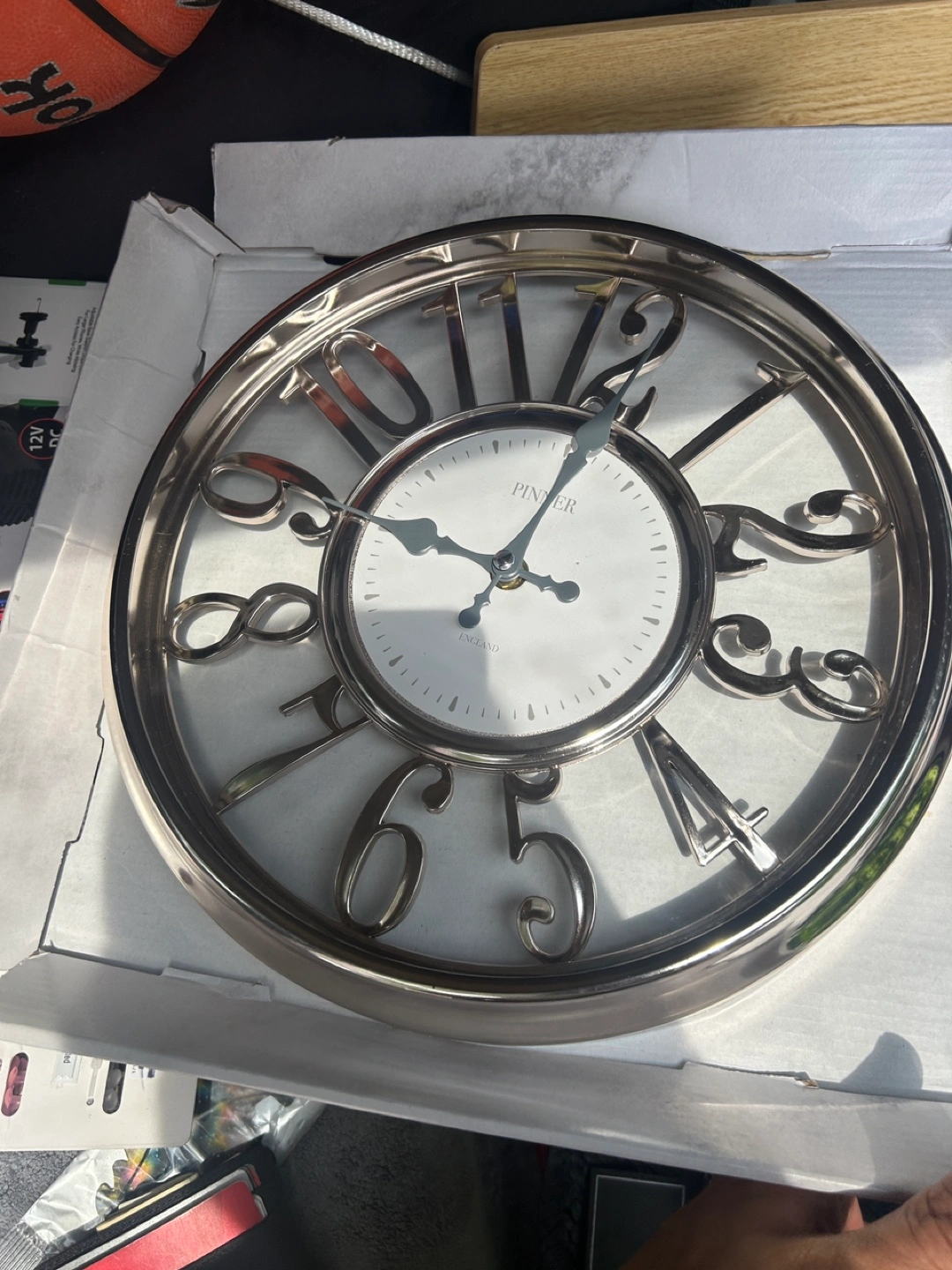 Selling a Pinner England wall clock with a silver finish. It's in great condition and ready to add a touch of elegance to your space!