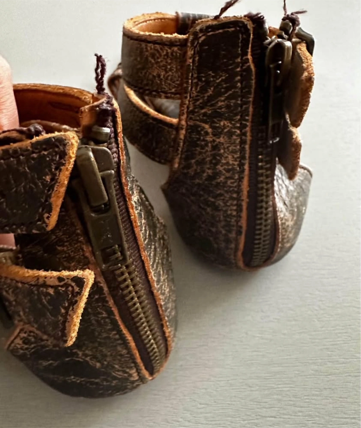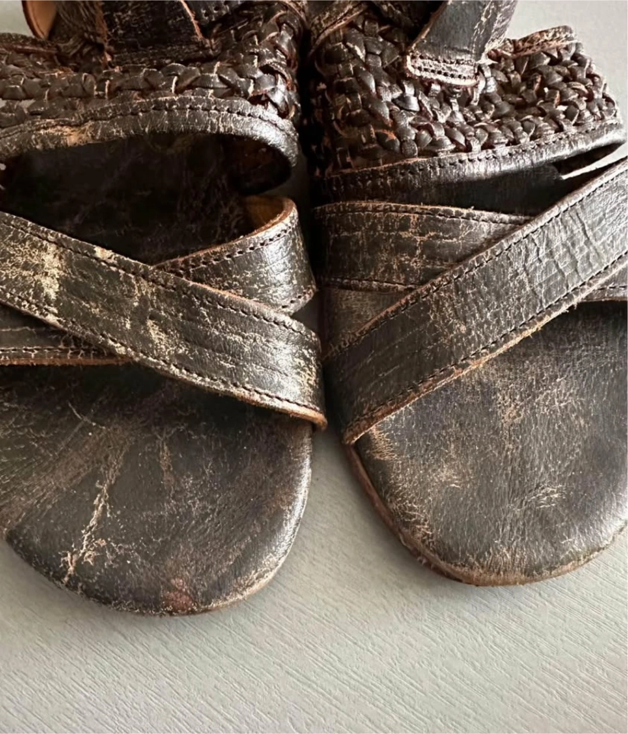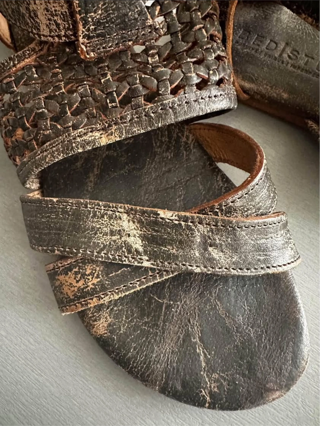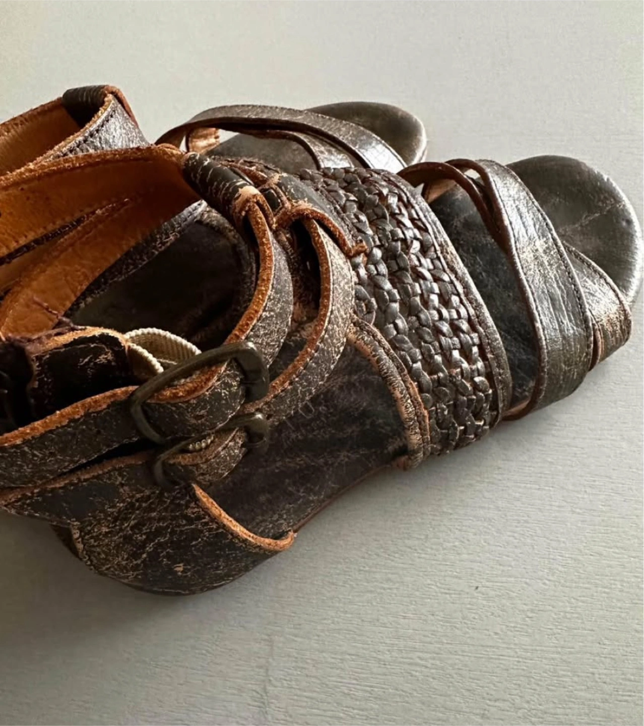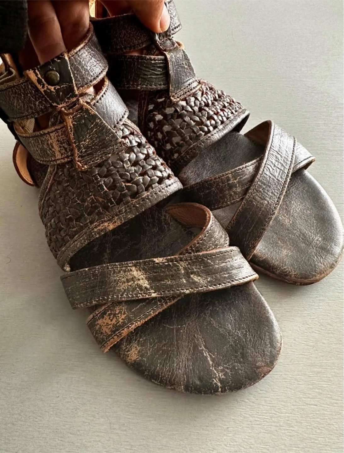 These are Bed Stu gladiator-style sandals in a women's size 7. They have a cool, distressed look with a zipper on the back. They are made in Mexico.