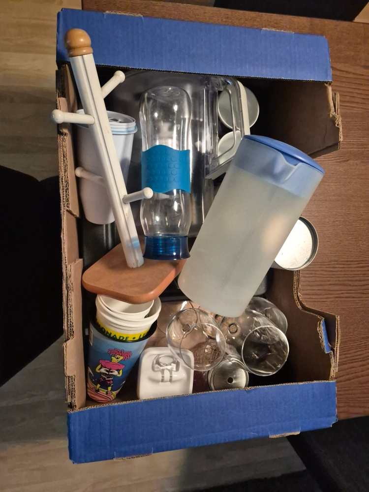Selling a box of assorted kitchen items. There's a variety of things in there, including glasses, containers, and other useful bits and bobs for your kitchen. Perfect if you're setting up a new home or just need some extra supplies! must take everything