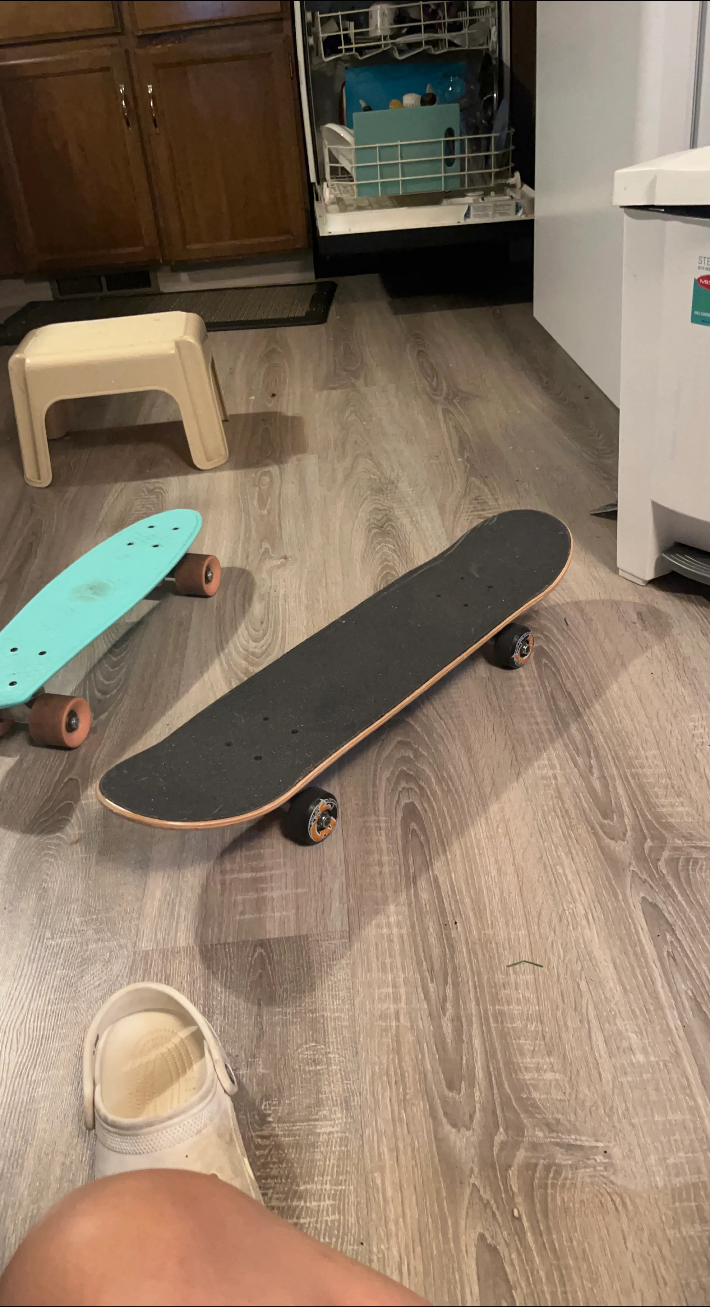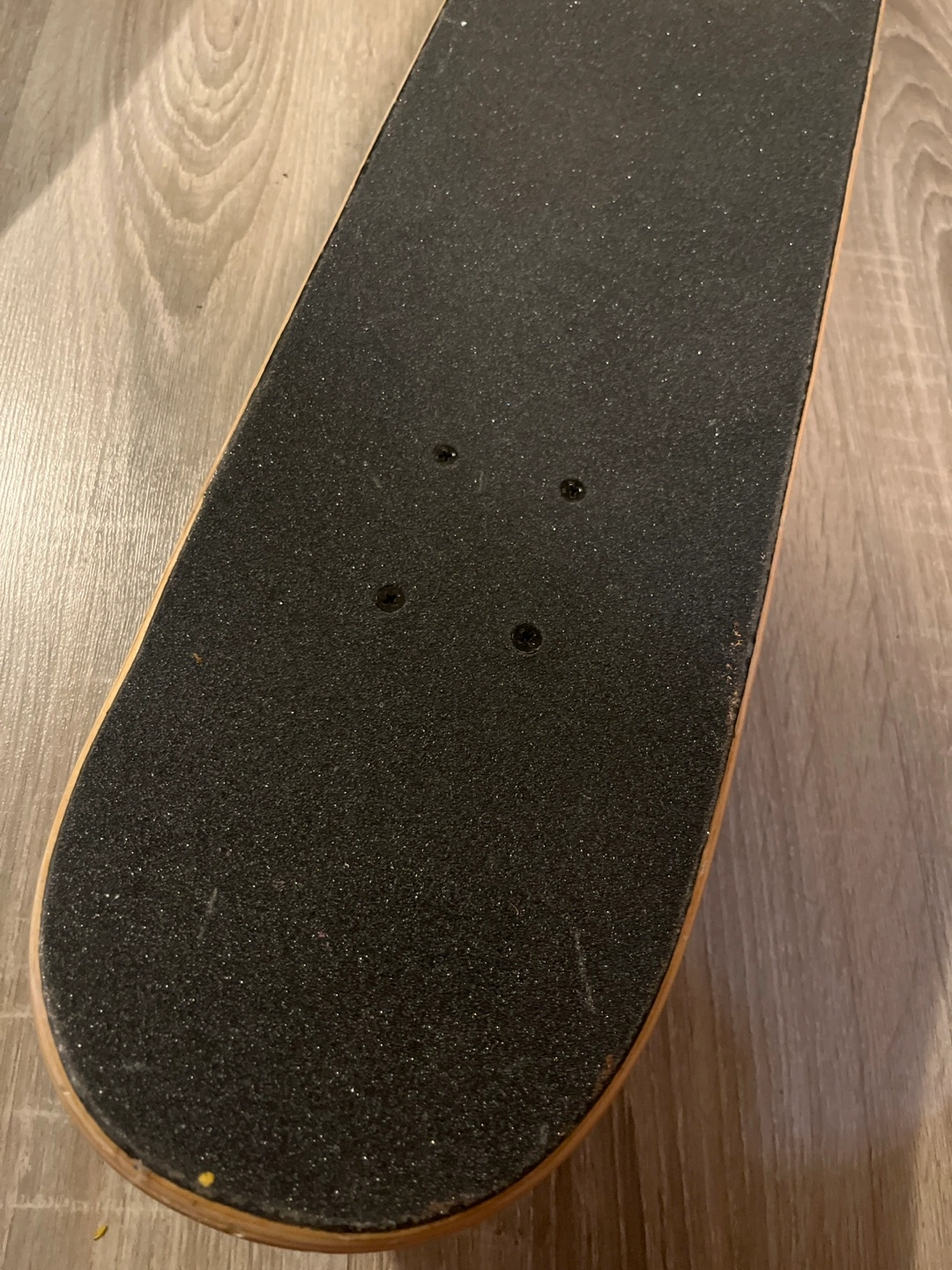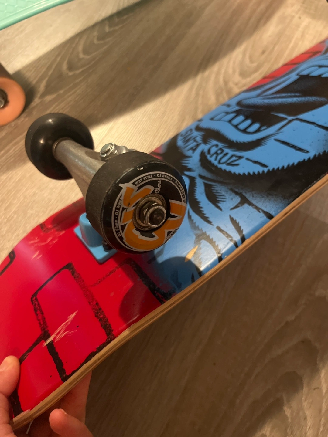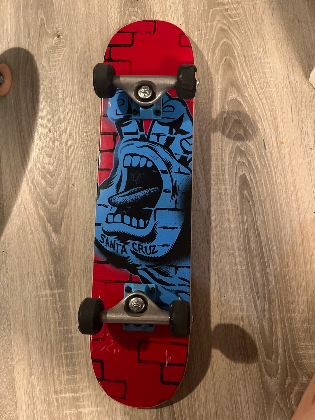 Selling a used skateboard. It features the iconic Santa Cruz Screaming Hand graphic on a red and blue background. The wheels are OJ Wheels.