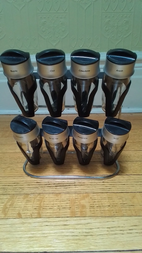 Here's a spice rack that comes with eight jars, perfect for organizing your favourite spices! The jars are labeled with different herbs and spices, including basil, chili, ciboulette, aneth, sel de mer, marjolaine, and persil. This rack is a great way to keep your spices handy and add a touch of organization to your kitchen