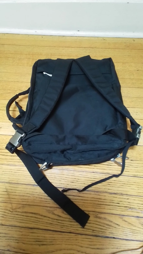 Selling a black laptop bag. It has two handles used as a tote and shoulder straps used as a backpack. The bag has a few compartments, including a padded section for a laptop. It's in good condition and ready for a new home!