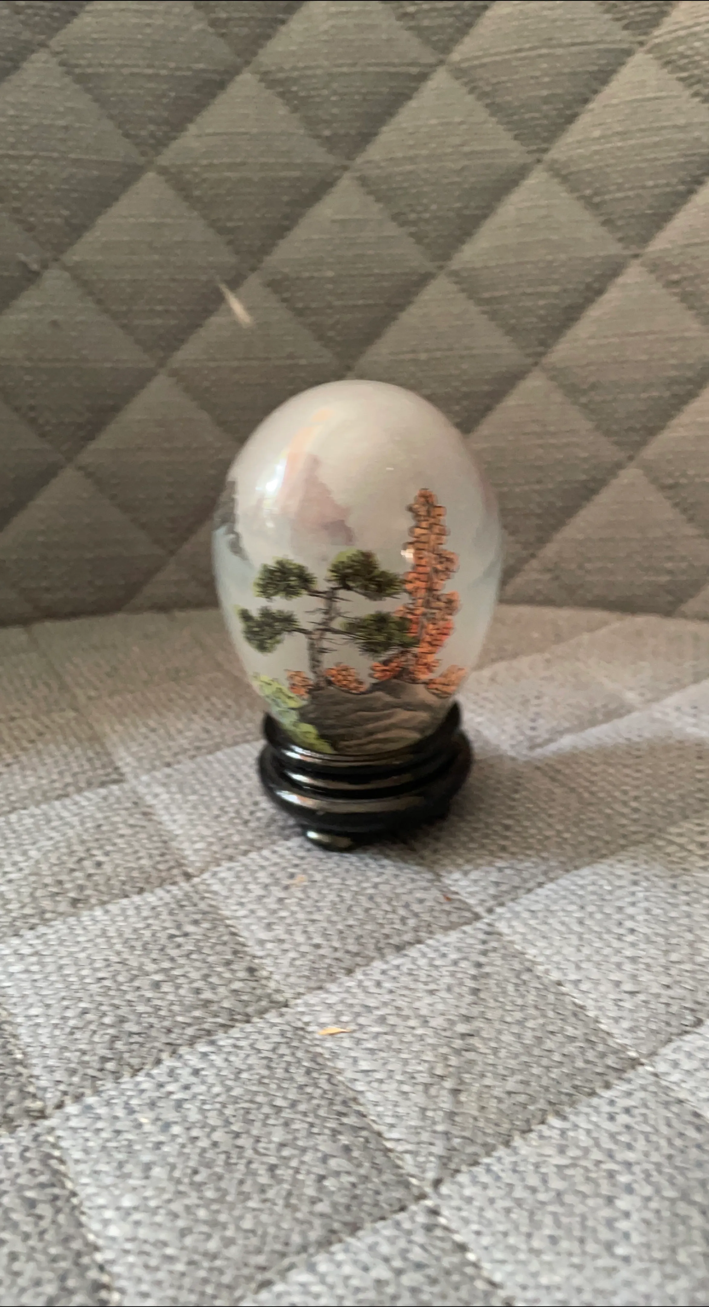 A delicate painted egg displayed on a small black stand. The egg features a beautiful landscape scene with trees and a pagoda. Perfect for adding a touch of elegance to any room!