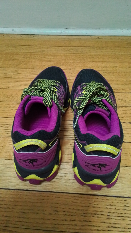 Selling a pair of Asics L-Gel FujiTrabuco 7 trail running shoes in women's size 8. They come in a stylish purple spectrum/black colour. The shoes are in good condition and comes with the original box.