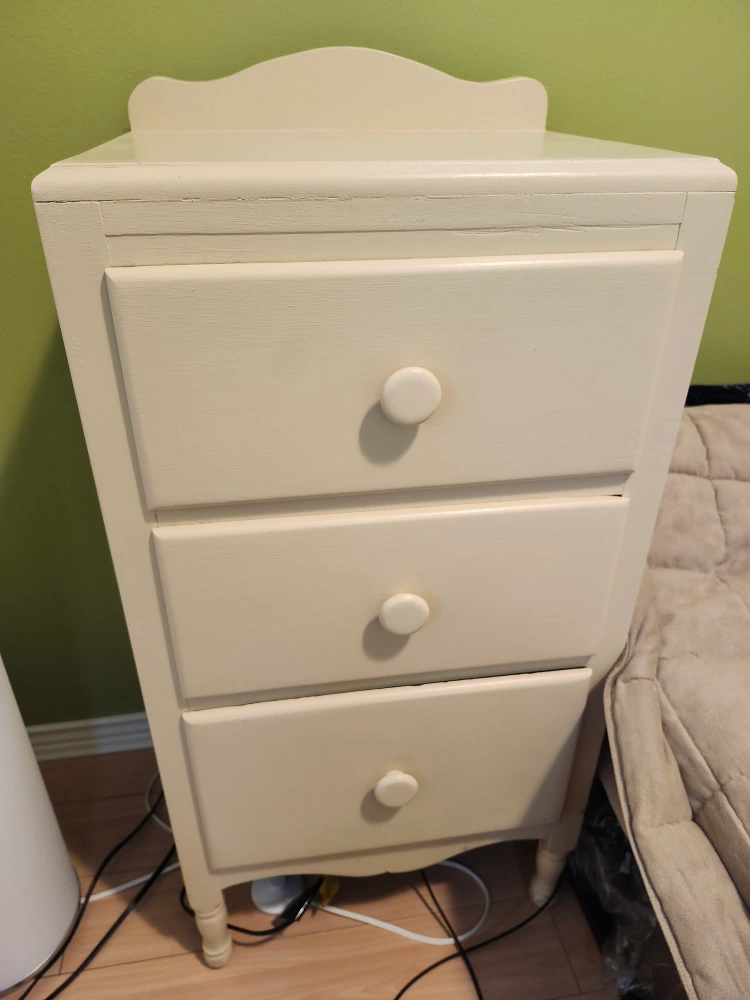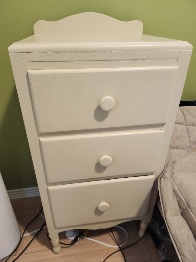 Here's a cute little cream-coloured dresser with three drawers! It's perfect for a kid's room or as a small accent piece in any room of the house