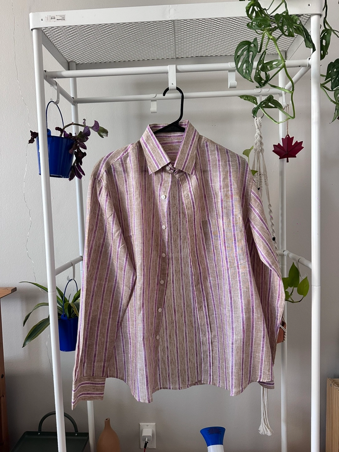 Here's a lightweight linen button-down shirt with a striped pattern! It's perfect for a relaxed, casual look. The material is nice and breathable, great for warmer weather