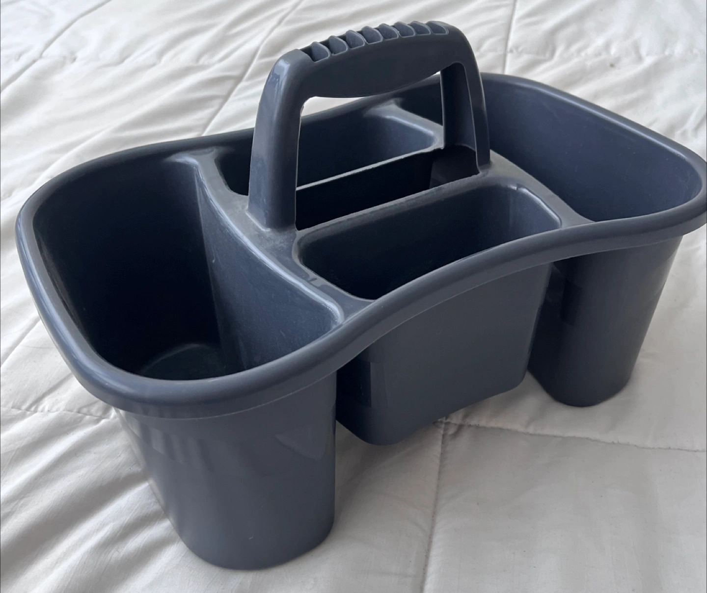 Here's a handy grey cleaning caddy! It's in great shape and ready to help you organize your cleaning supplies