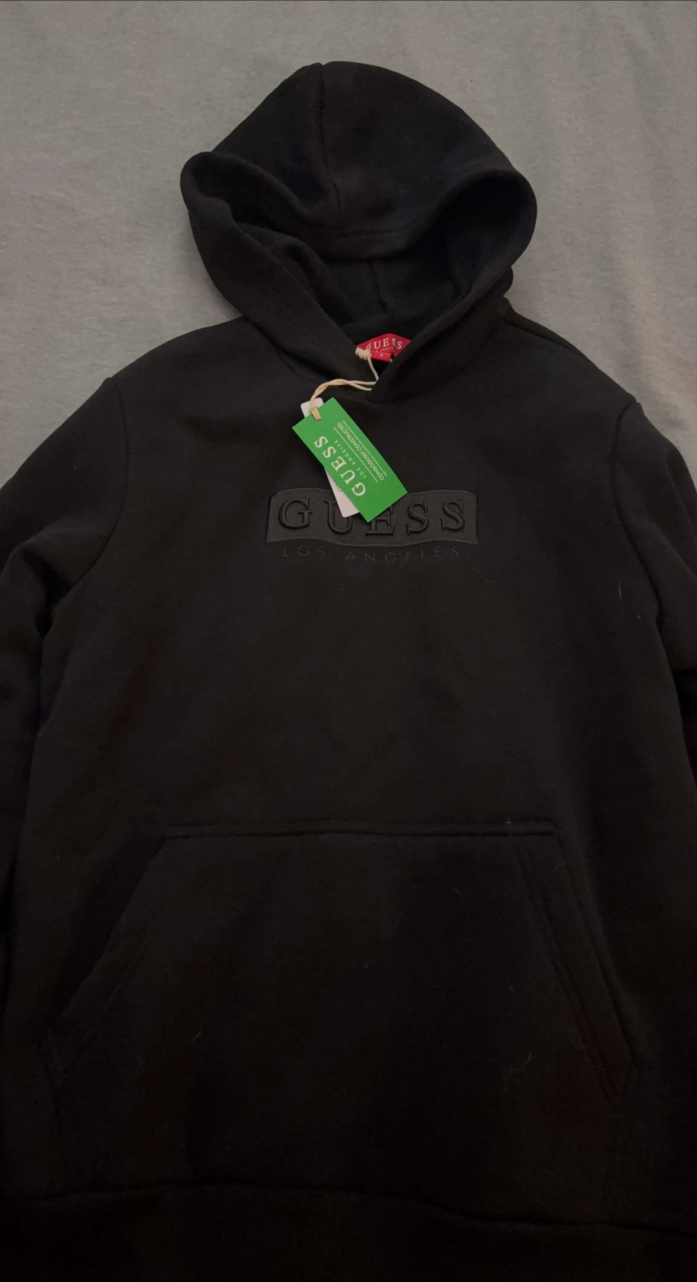 Selling a brand new Guess Los Angeles hoodie in black, size small! It still has the original tags attached. The hoodie is made with consciously constructed material and contains recycled fibers. Perfect for staying cozy!