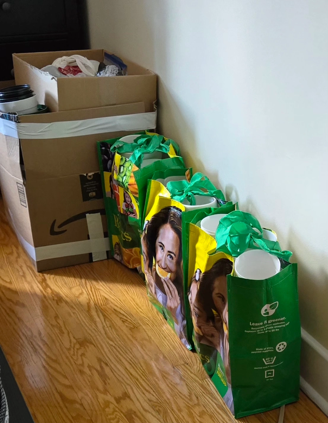 All packed and ready to go in 3 big shopping bags and 1 big box.