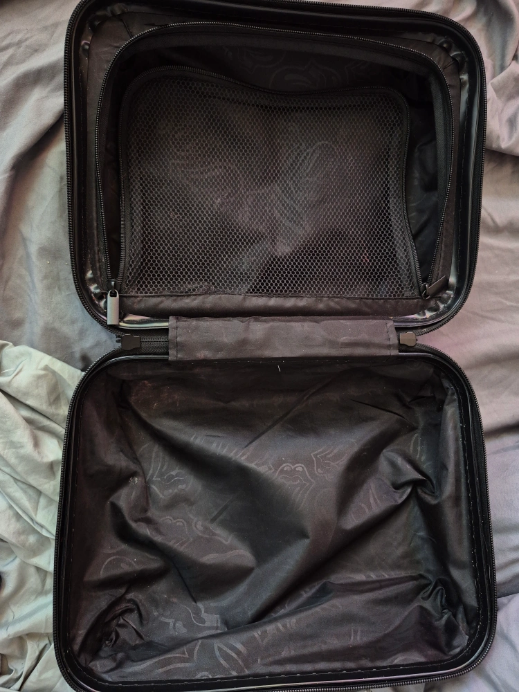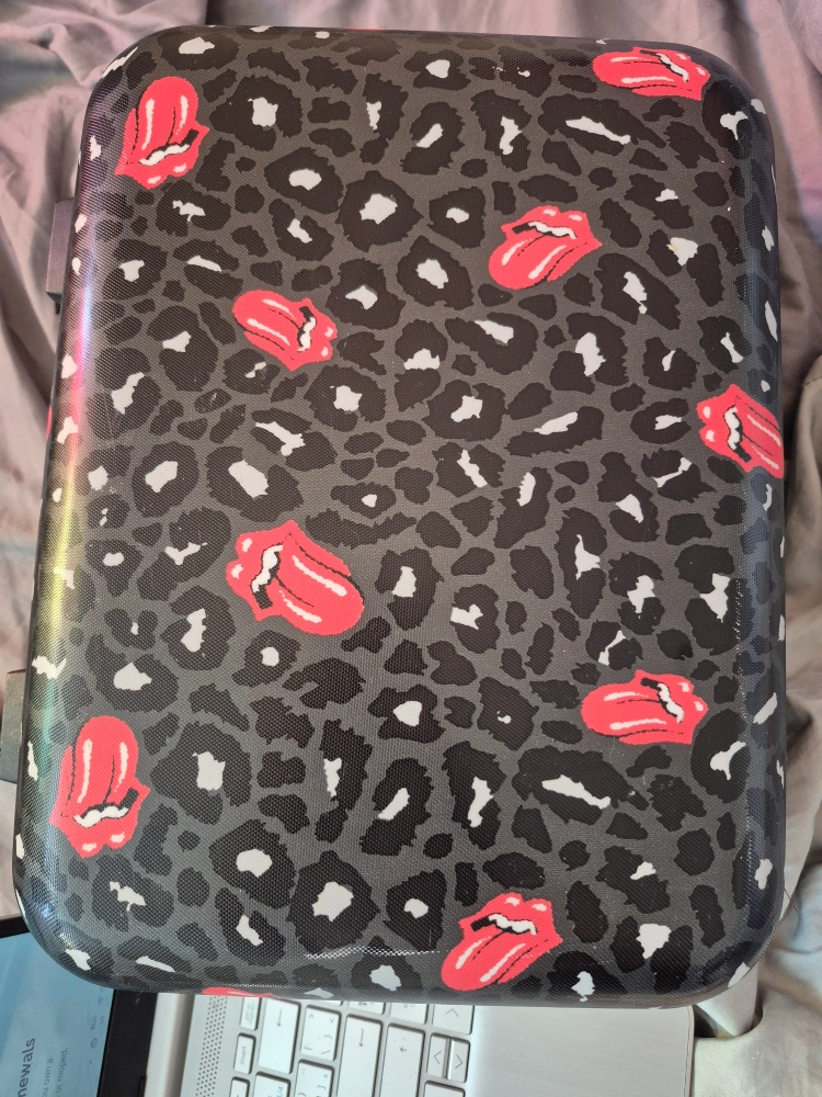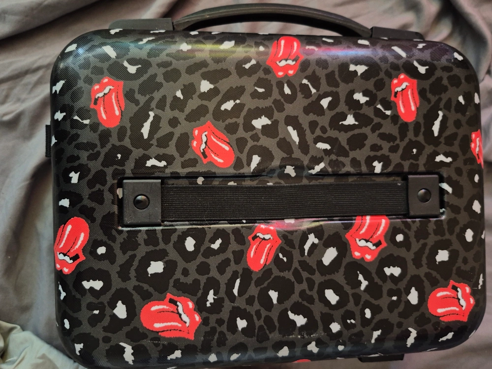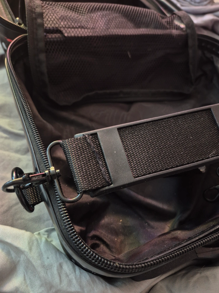 has a handle on the side and sets of four for it to stand up straight. Also, a side slipping handle (adjustable). Comes with strapped adjustable handle.