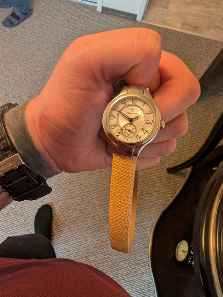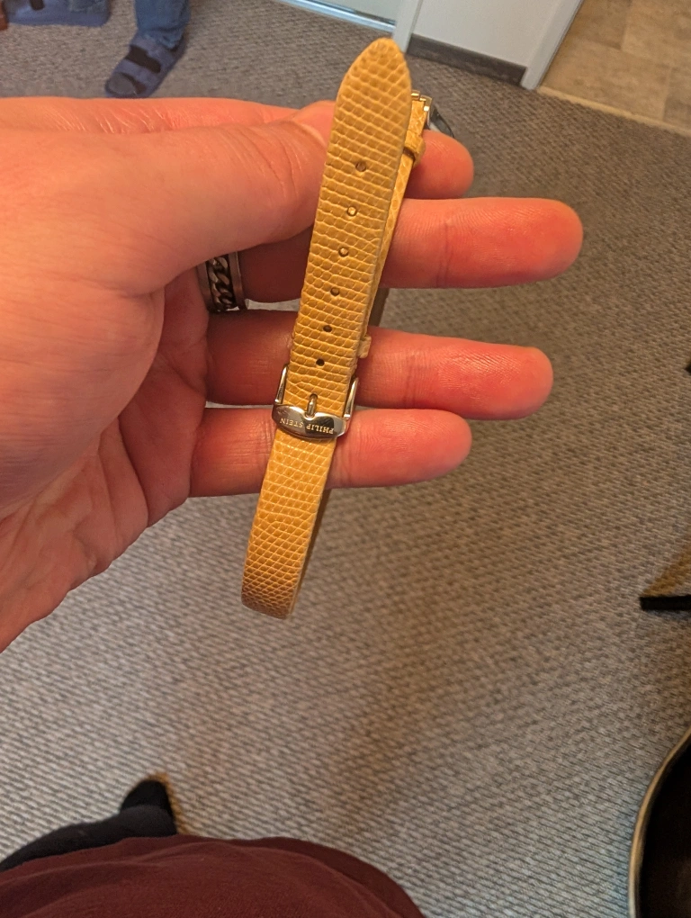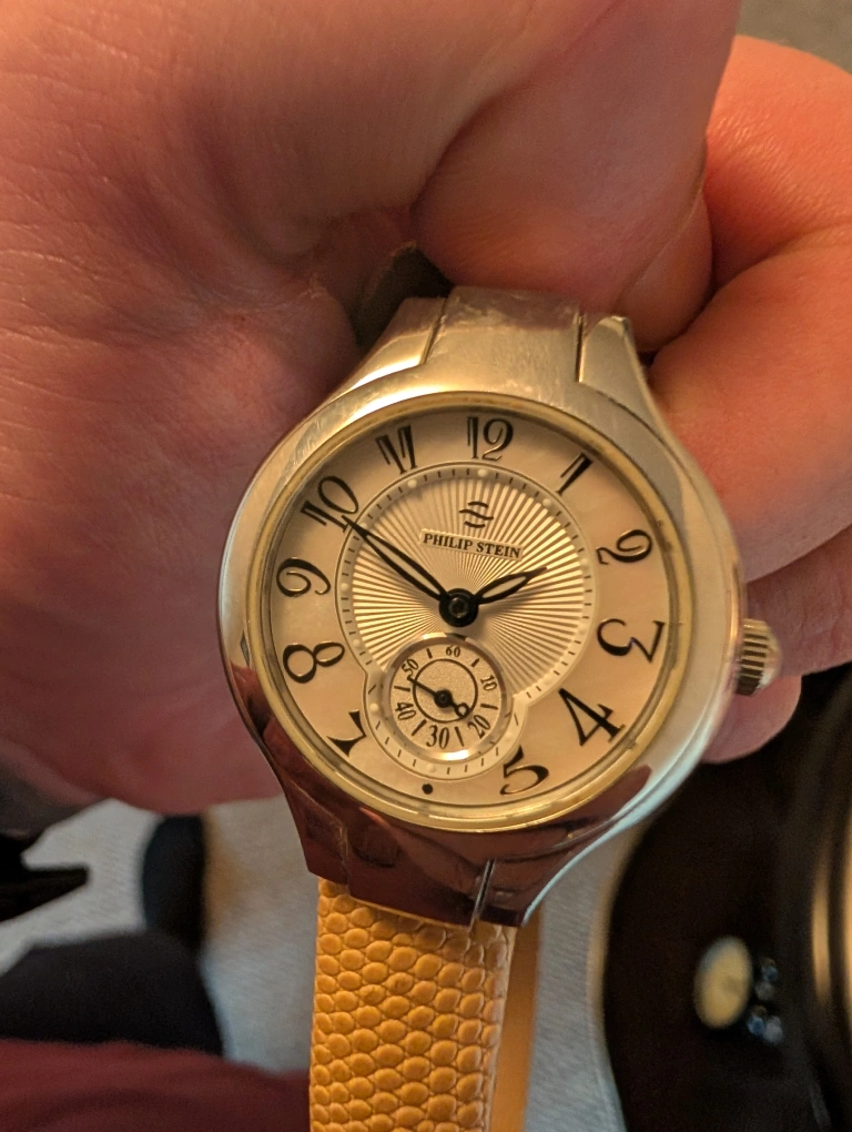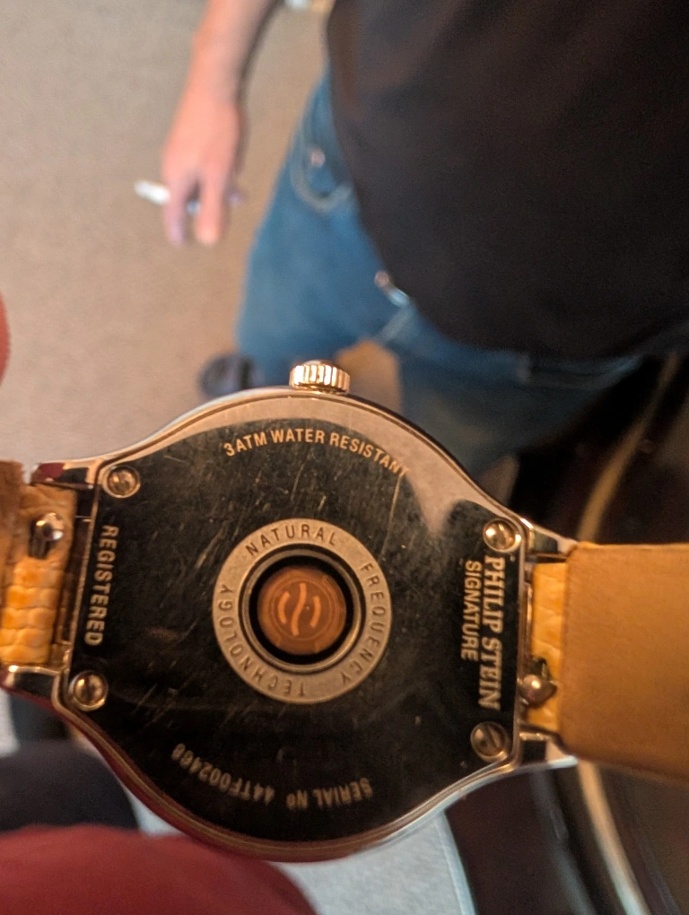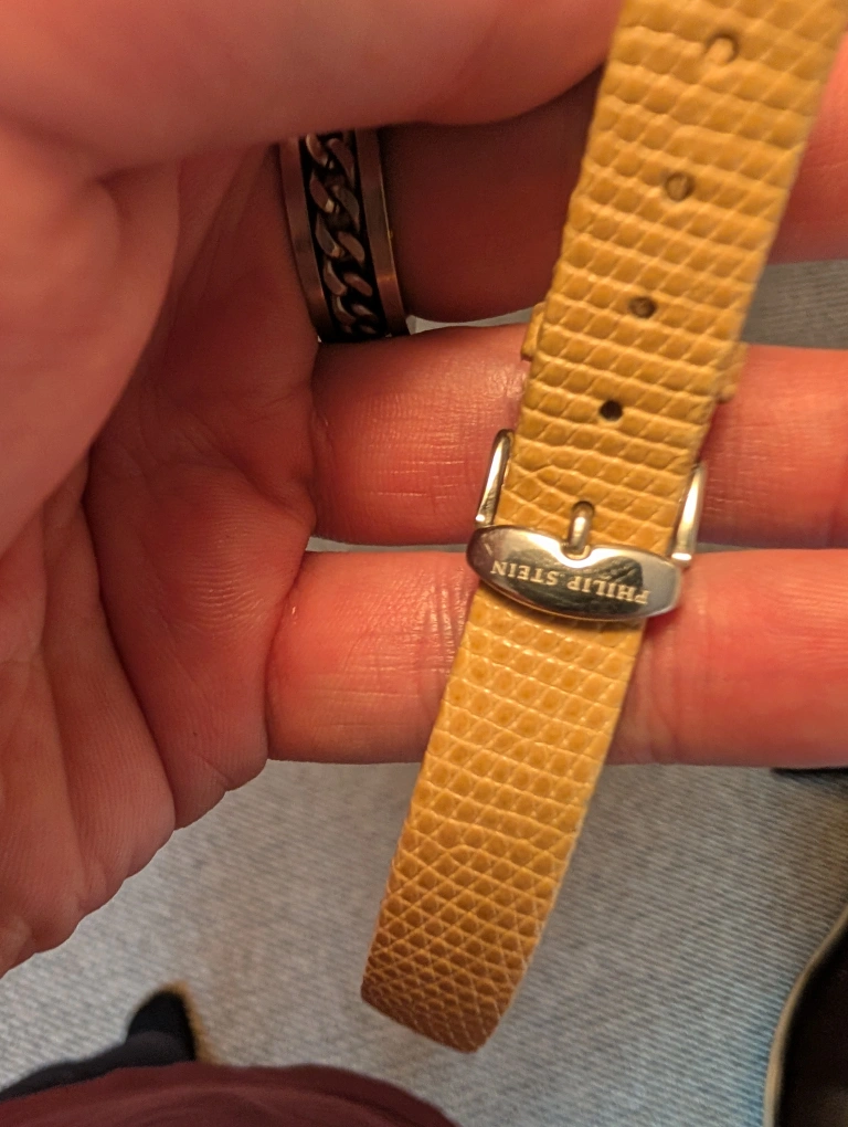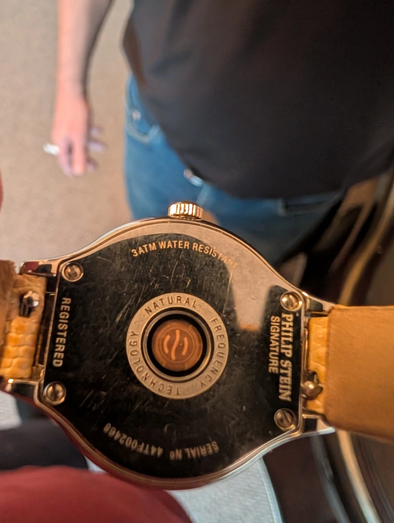 Selling a Philip Stein watch with a unique yellow lizard skin textured band. It features a silver-tone case and a distinctive dial design. The back of the watch indicates it's 3ATM water-resistant and part of the 'Natural Frequency Technology' collection