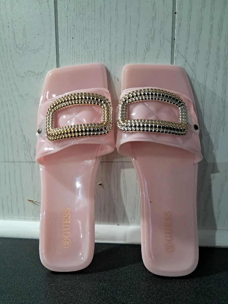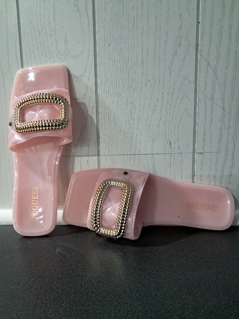 Cute pink jelly slides from Guess! These are a size 9 and feature a decorative buckle detail. Perfect for summer! Contact 437 717 6277. Location Scarborough ON.