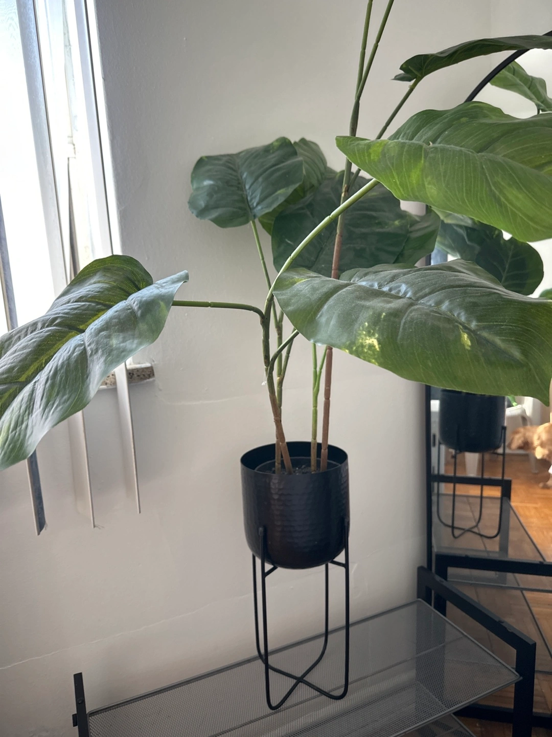 Selling a faux potted plant with a black stand. It's in great condition and would look lovely in any room. It's a great way to add some greenery to your space without the hassle of taking care of a real plant