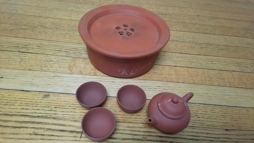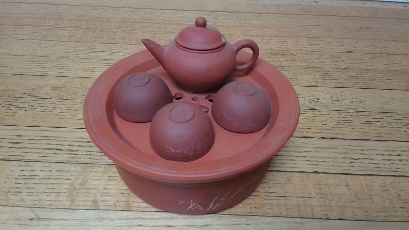 Selling a clay tea set that includes a teapot, threel cups, and a stand. The teapot has a crack on the lid. Please see the photos for details!