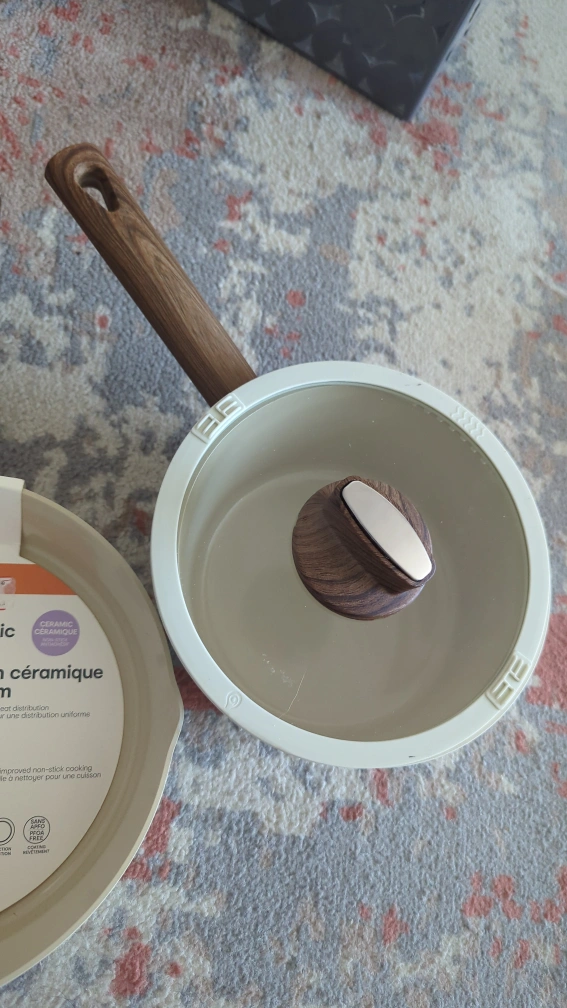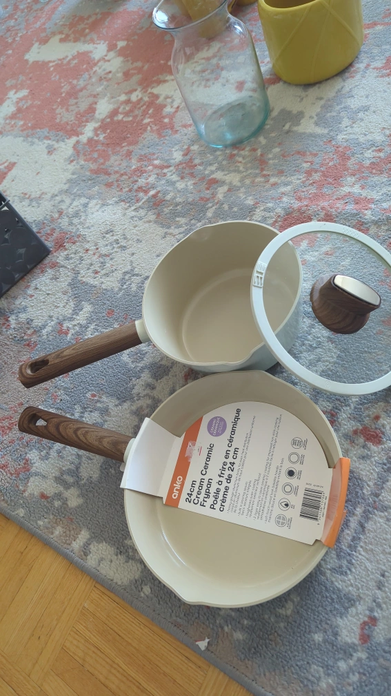 Selling a 24cm Anko cream ceramic frypan and saucepan with a lid. The frypan is perfect for everyday cooking. The saucepan is great for sauces and heating liquids. Both have a stylish wooden handle.