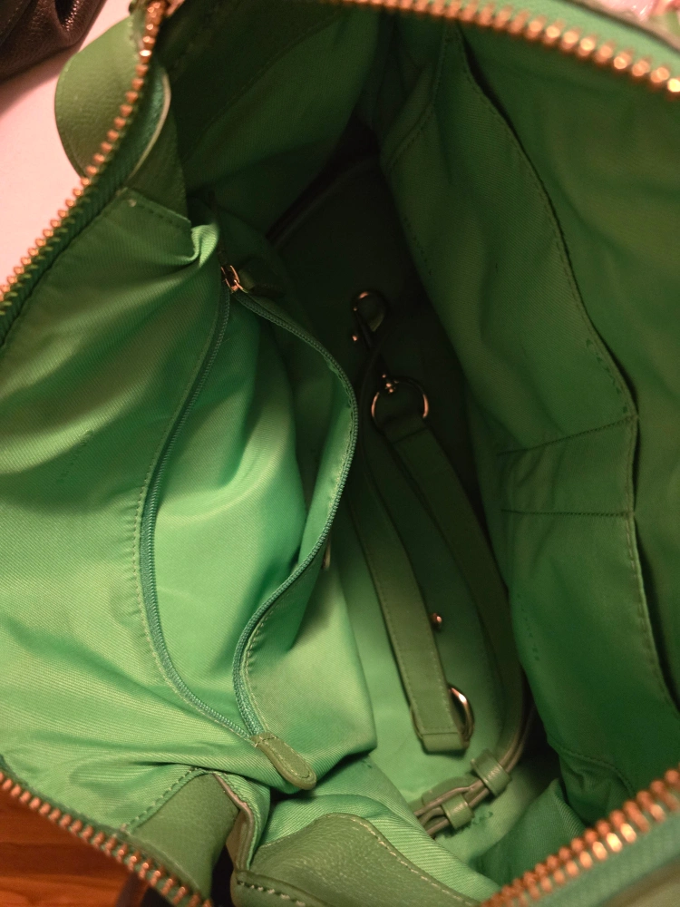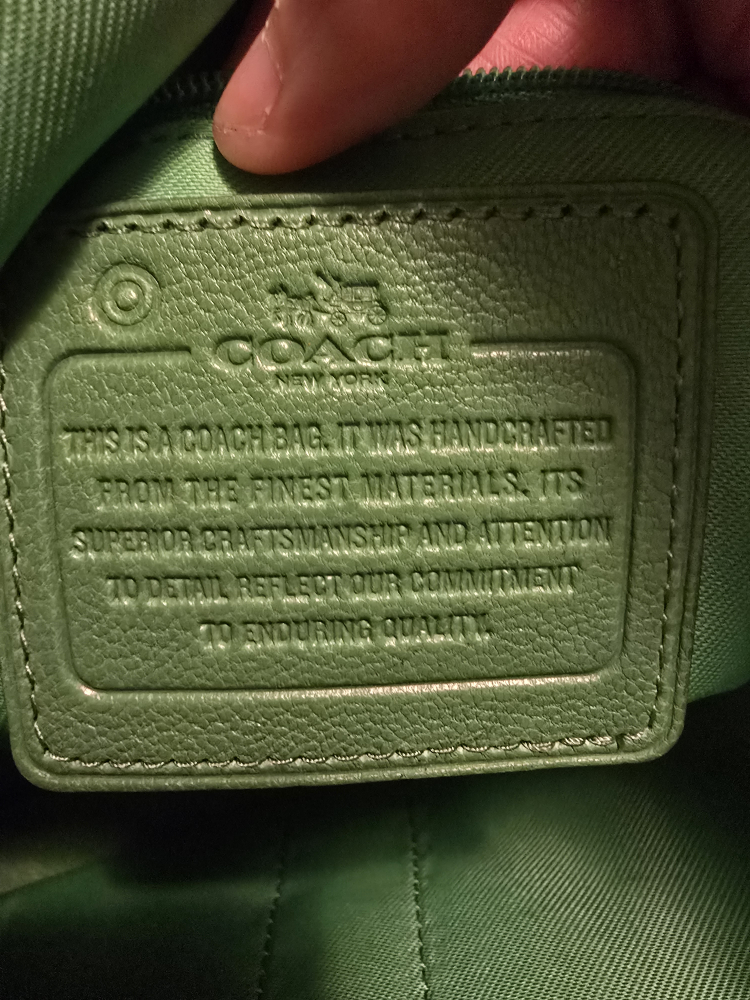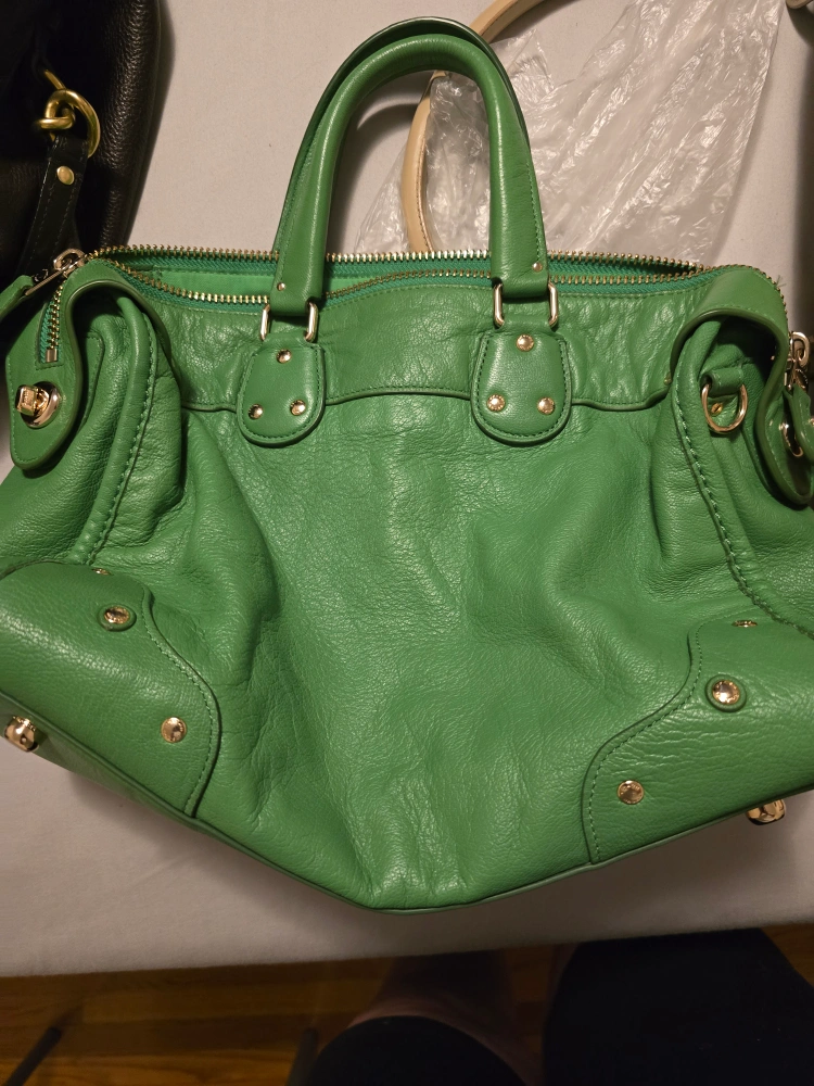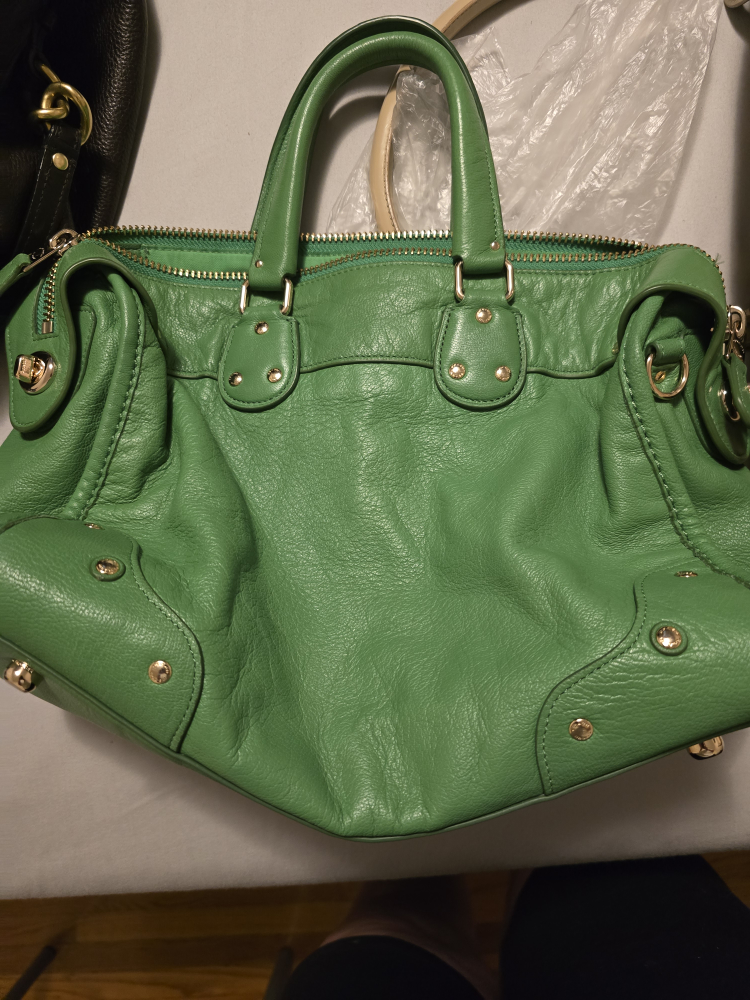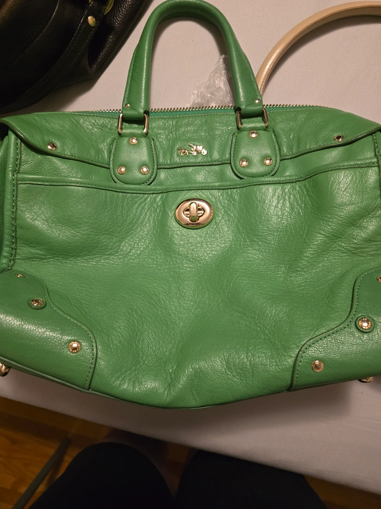 Selling a green leather Coach handbag. It's in great condition and has a unique design with gold-tone hardware. Perfect for adding a pop of colour to your outfit!