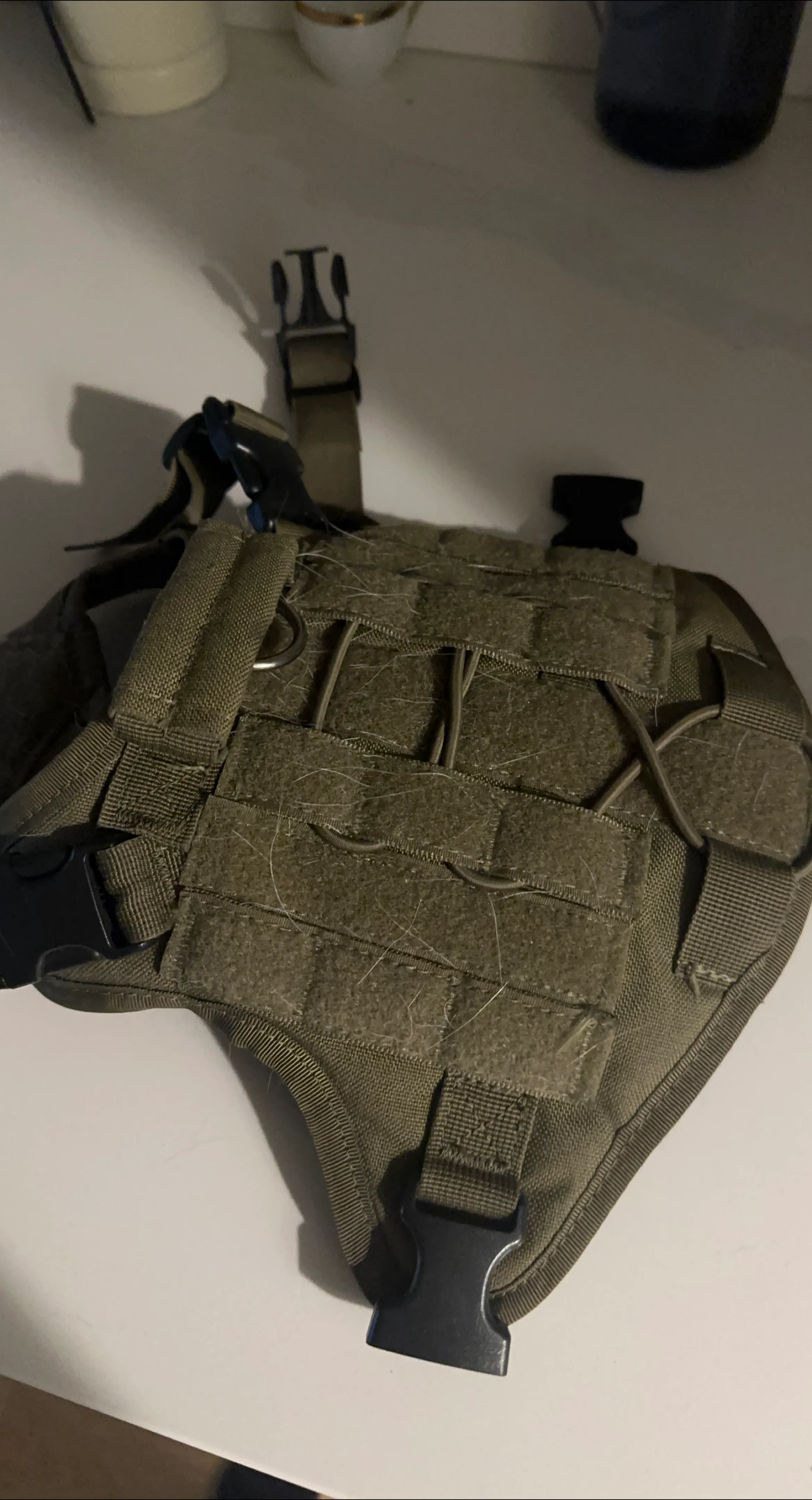 Selling a tactical dog harness in olive green. It features adjustable straps and durable buckles. Good for training or outdoor adventures!