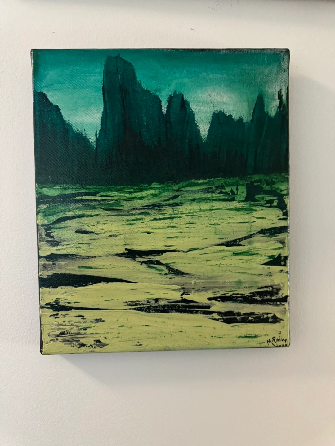 Original landscape painting, perfect for adding a touch of nature to your home! The painting features a serene scene with mountains and a field.