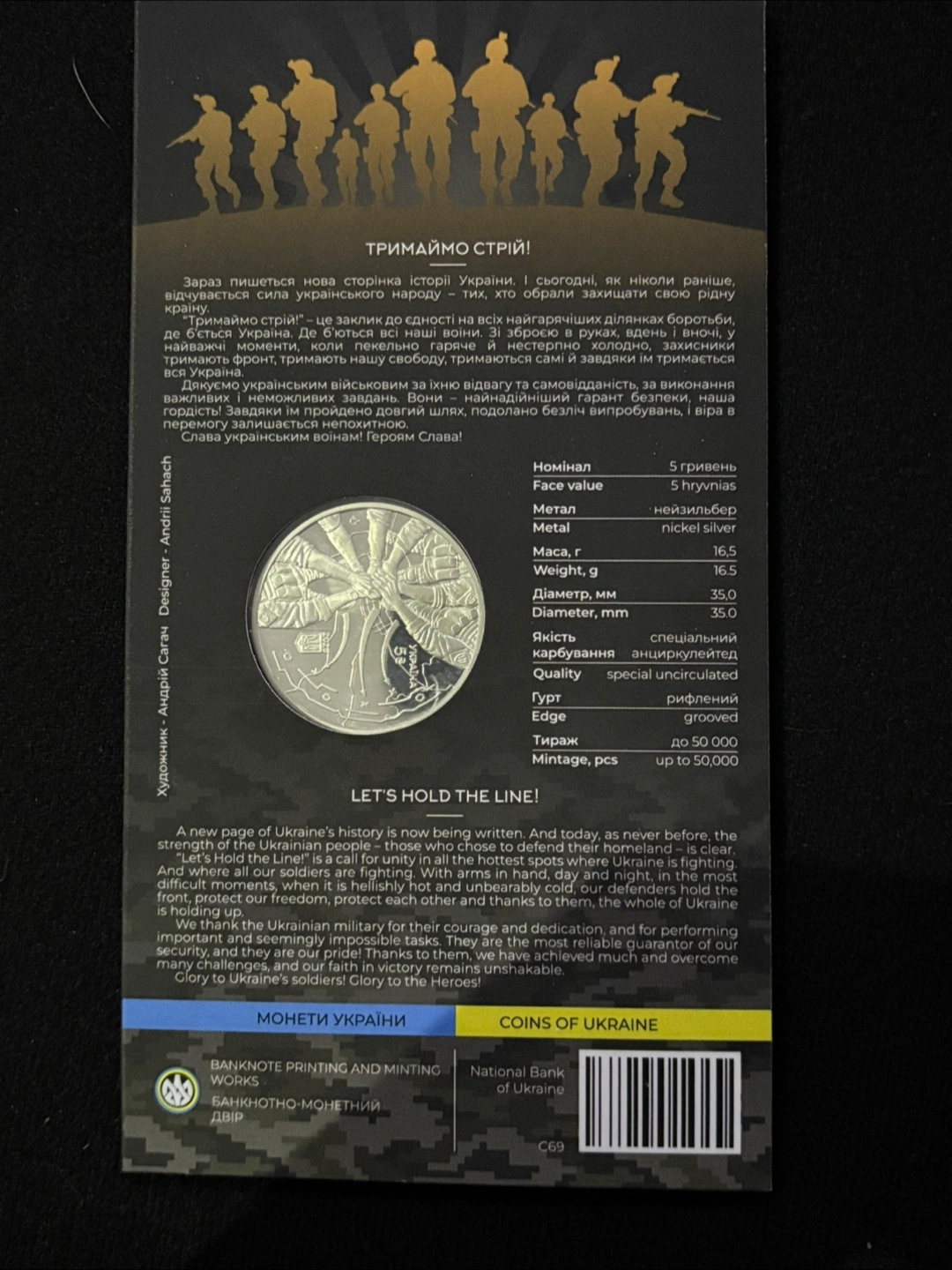 Selling a commemorative Ukrainian coin titled "Let's Hold The Line!". It's in great condition and comes in its original packaging. A piece of history and solidarity!
