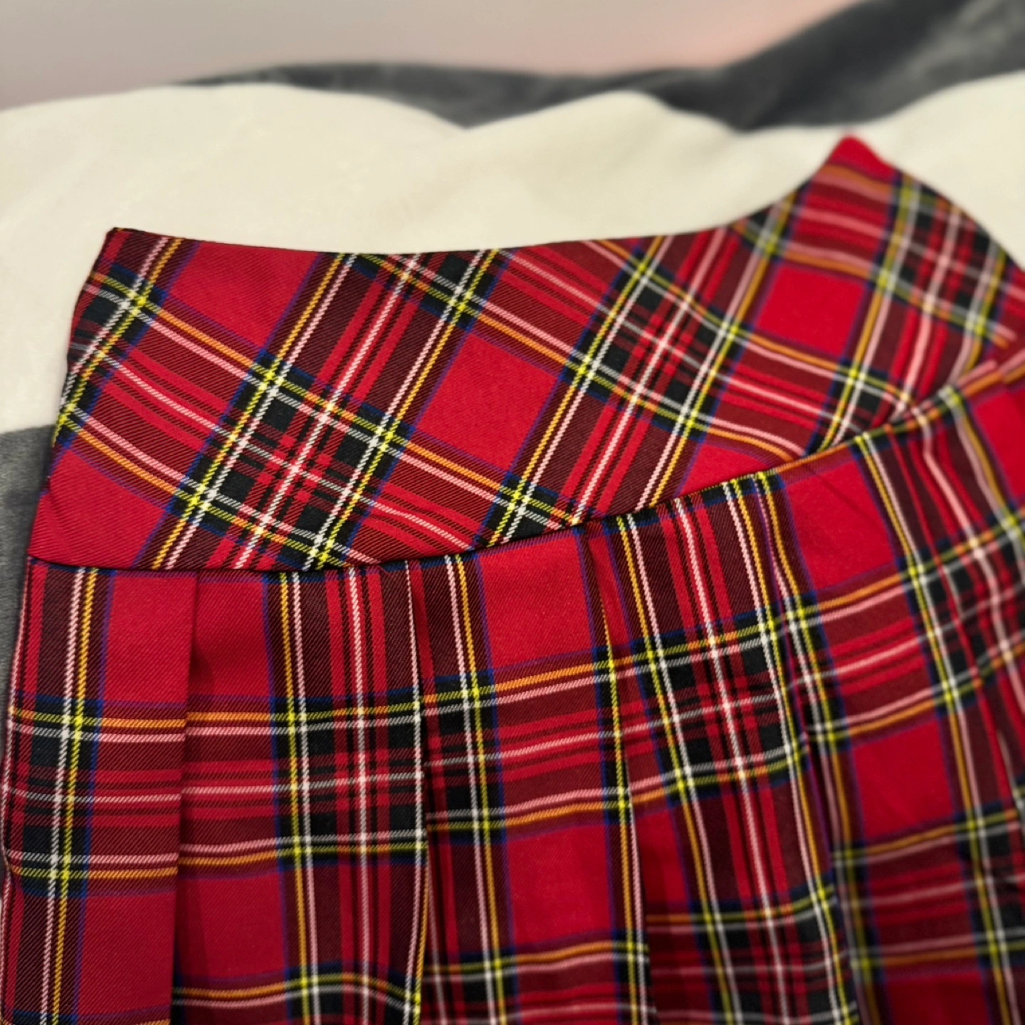Selling a cute red plaid pleated skirt! It's new and perfect for adding a bit of flair to your wardrobe. The skirt has a classic plaid pattern with pleats all around. It would be a great addition to any outfit!