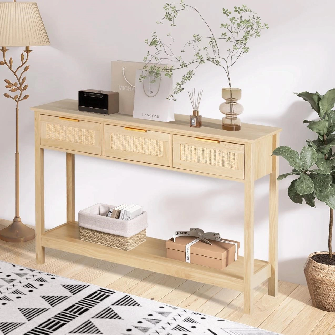 This rattan console table is perfect for adding a touch of natural style to your home. It features smooth-sliding drawers and a stable, waterproof structure. Dimensions are 51.37" x 11.81" x 32.08".