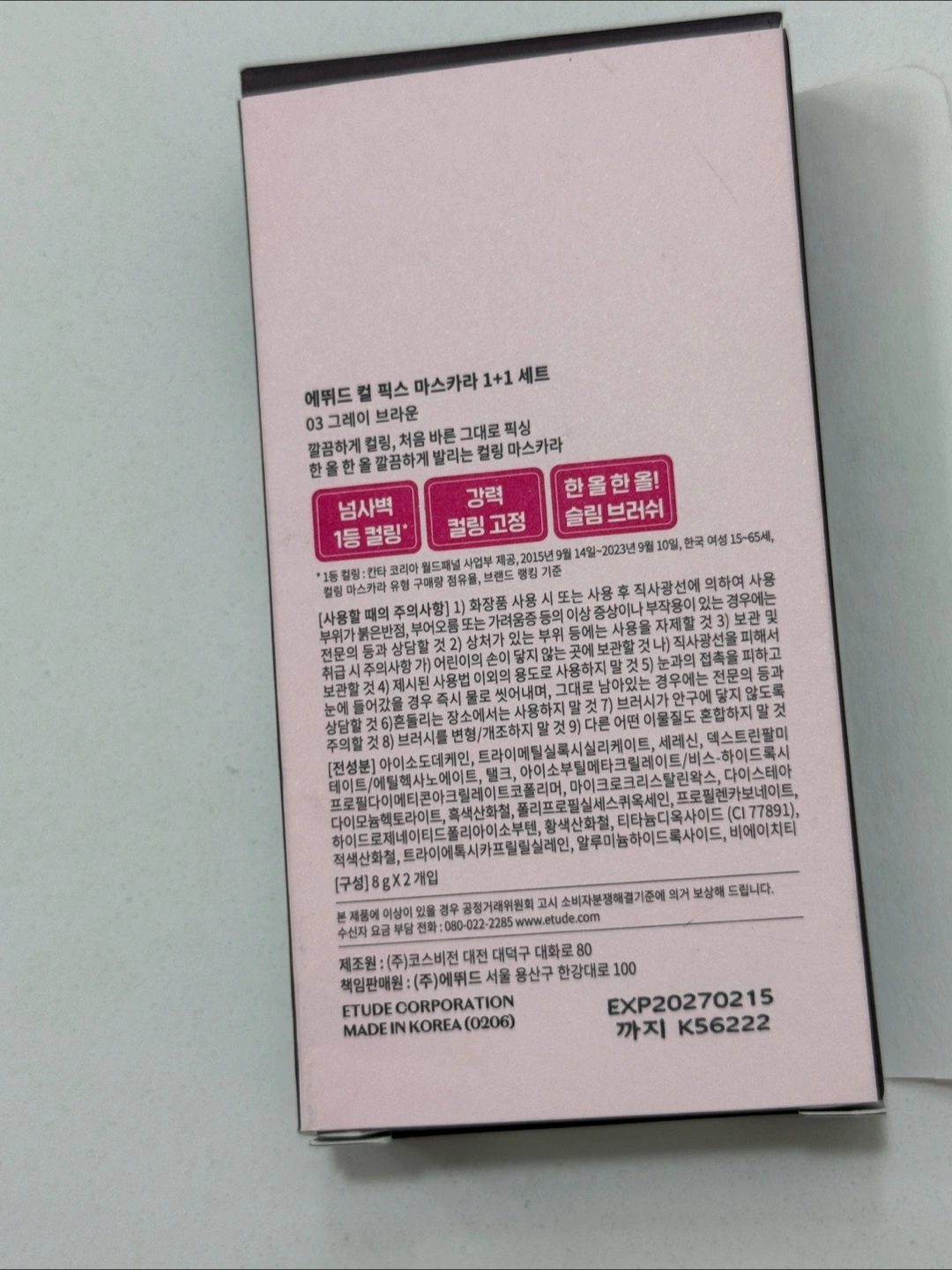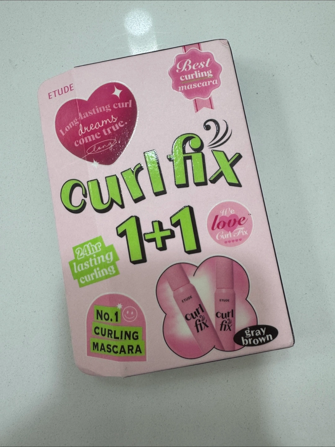 Selling an Etude Curl Fix Mascara 1+1 in Gray Brown. It promises long-lasting curl dreams and 24hr lasting curling. The box says it's the No.1 Curling Mascara. The expiration date is 2027 February 15.