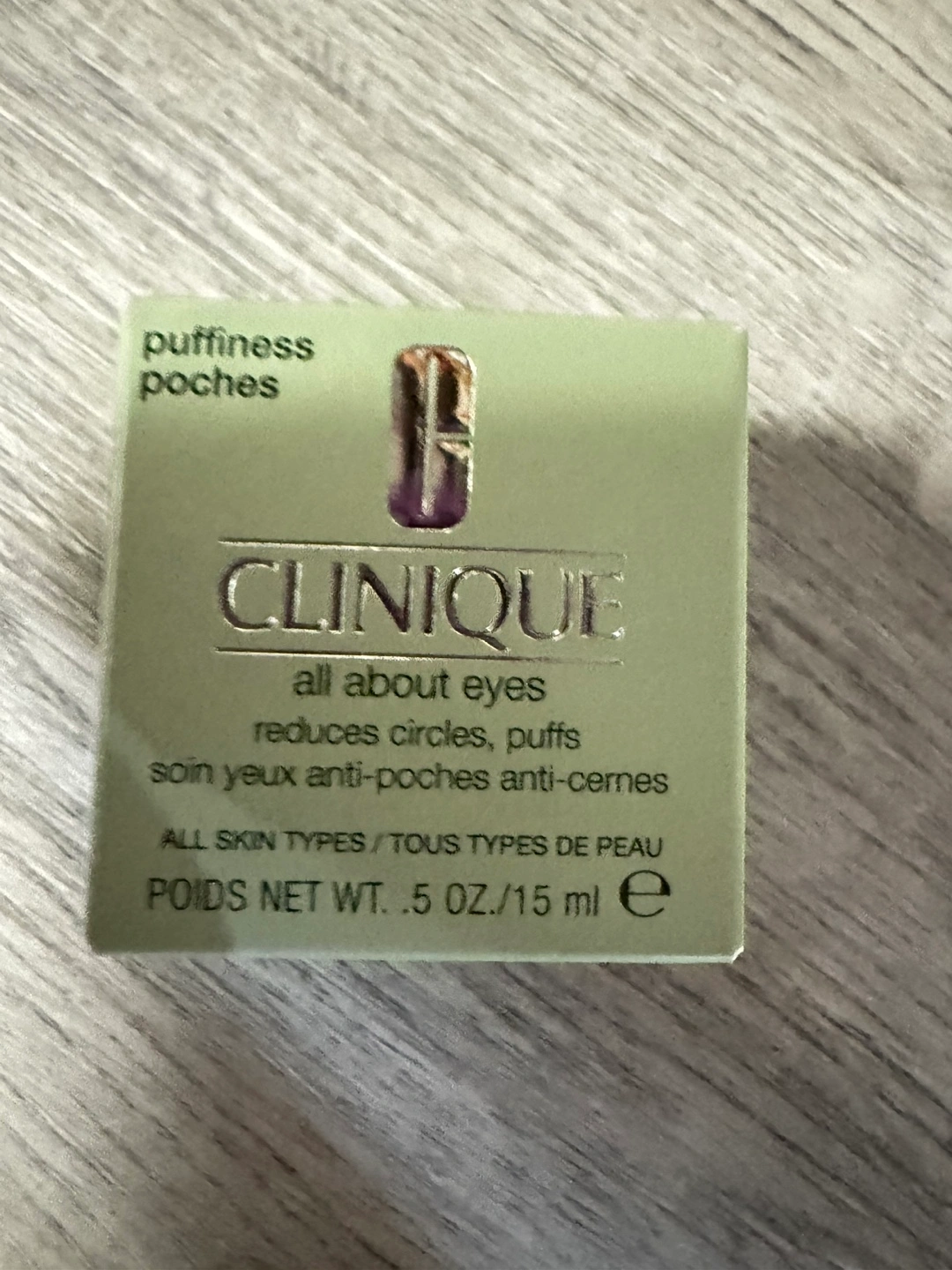 Selling a Clinique All About Eyes cream that reduces circles and puffiness. It's suitable for all skin types and contains .5 oz/15 ml of product