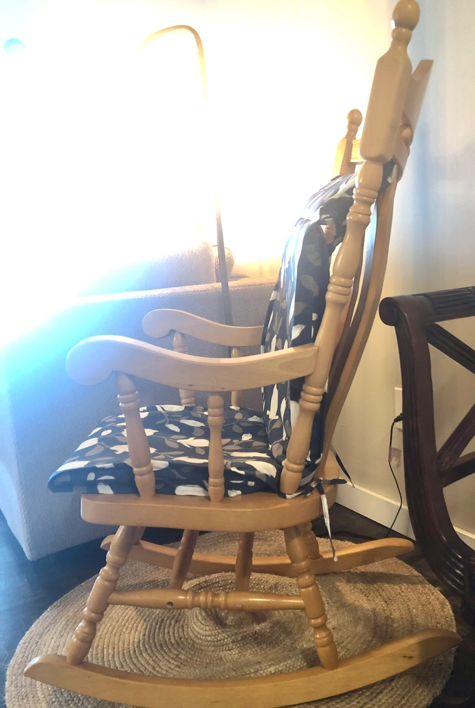 A lovely wooden rocking chair, perfect for a nursery or living room! It comes with a comfortable cushion featuring a beautiful floral pattern in shades of blue, black, and white. The chair is in great condition and ready to provide relaxing moments in your home