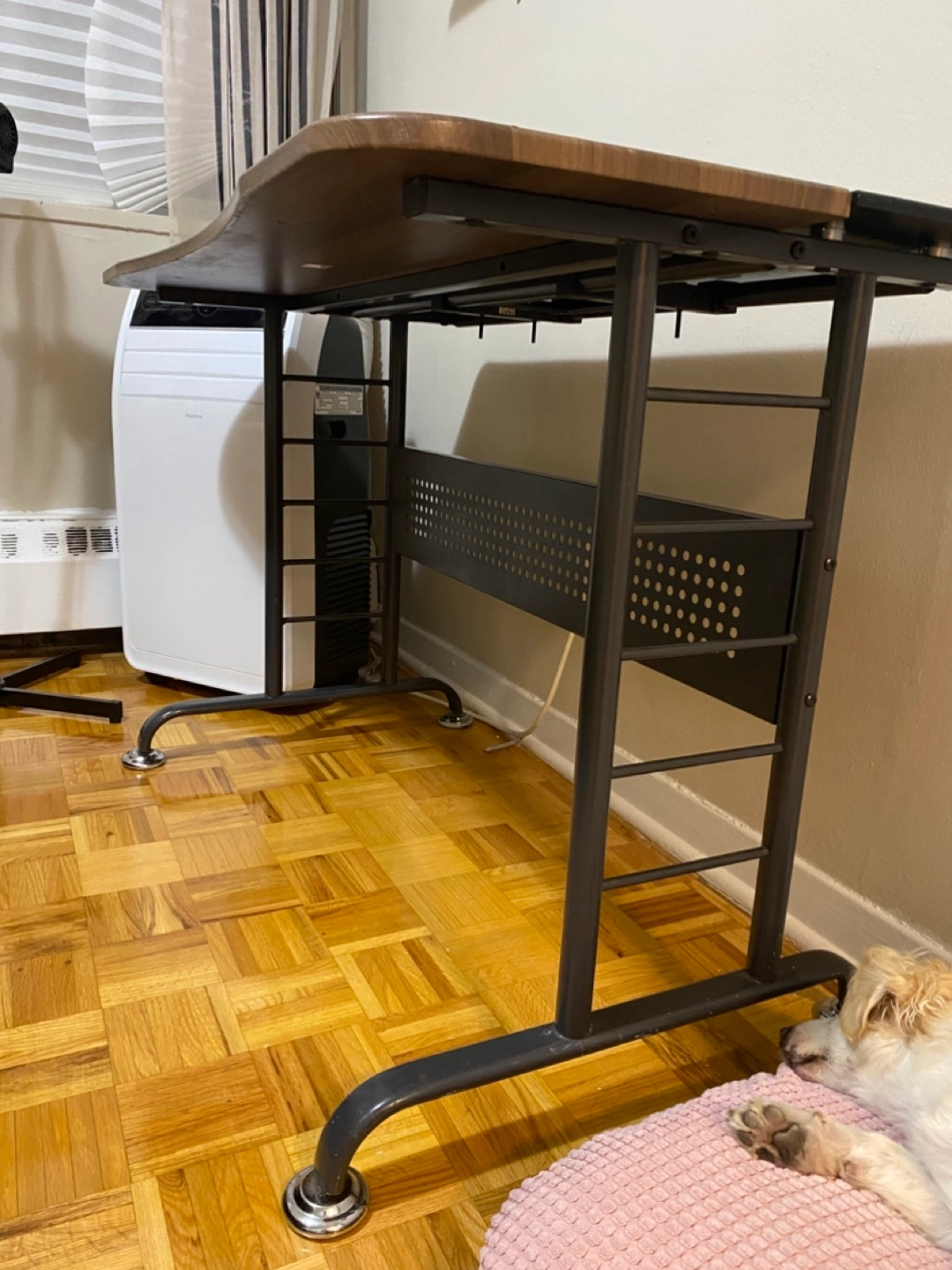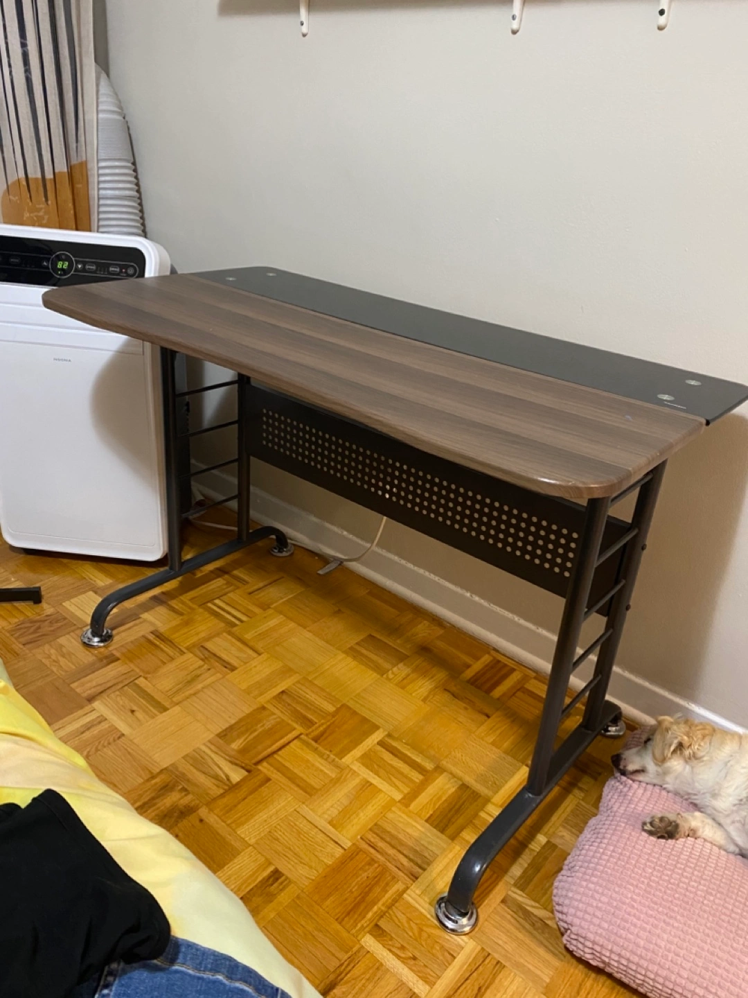 Computer desk/work desk. Mix of plexiglass and “wood” for the top.