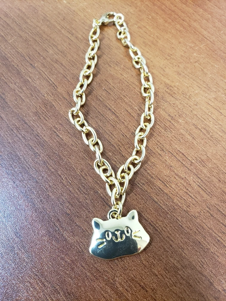 This is a cute gold-coloured charm bracelet (not sure what the material actually is) featuring a cat pendant from Gabby's Dollhouse. It's in great condition. the lobster clasp and chain make it adjustable for all wrist sizes