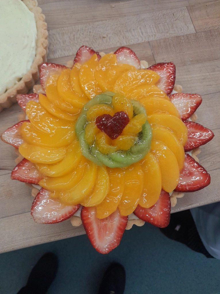 I'm a baking student at george brown and made two fruit tarts in class, but they are best enjoyed fresh and I won't be able to eat them both! Made with shortbread crust, chocolate coating, vanilla bean custard, and a mix of fresh and canned fruit with apricot glaze.