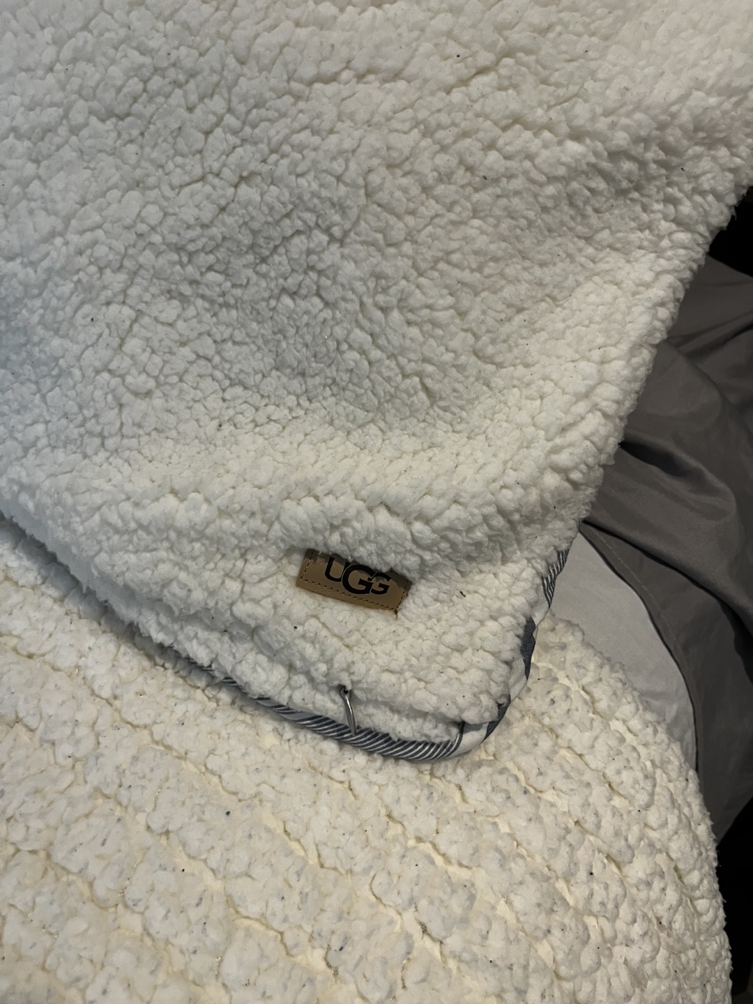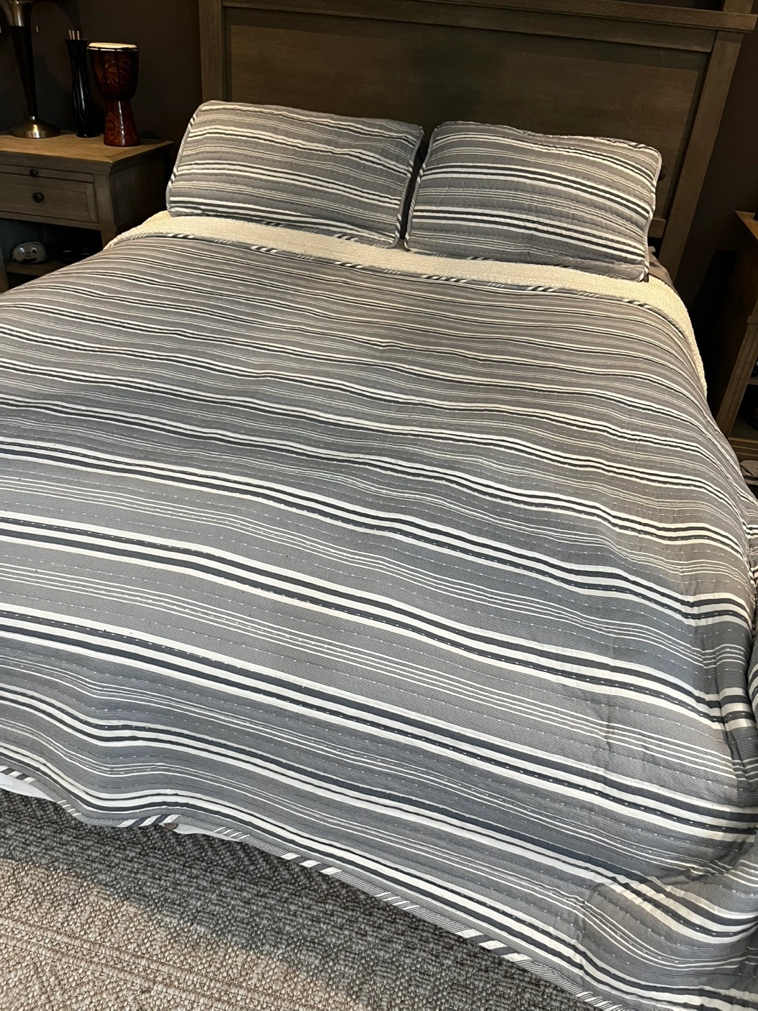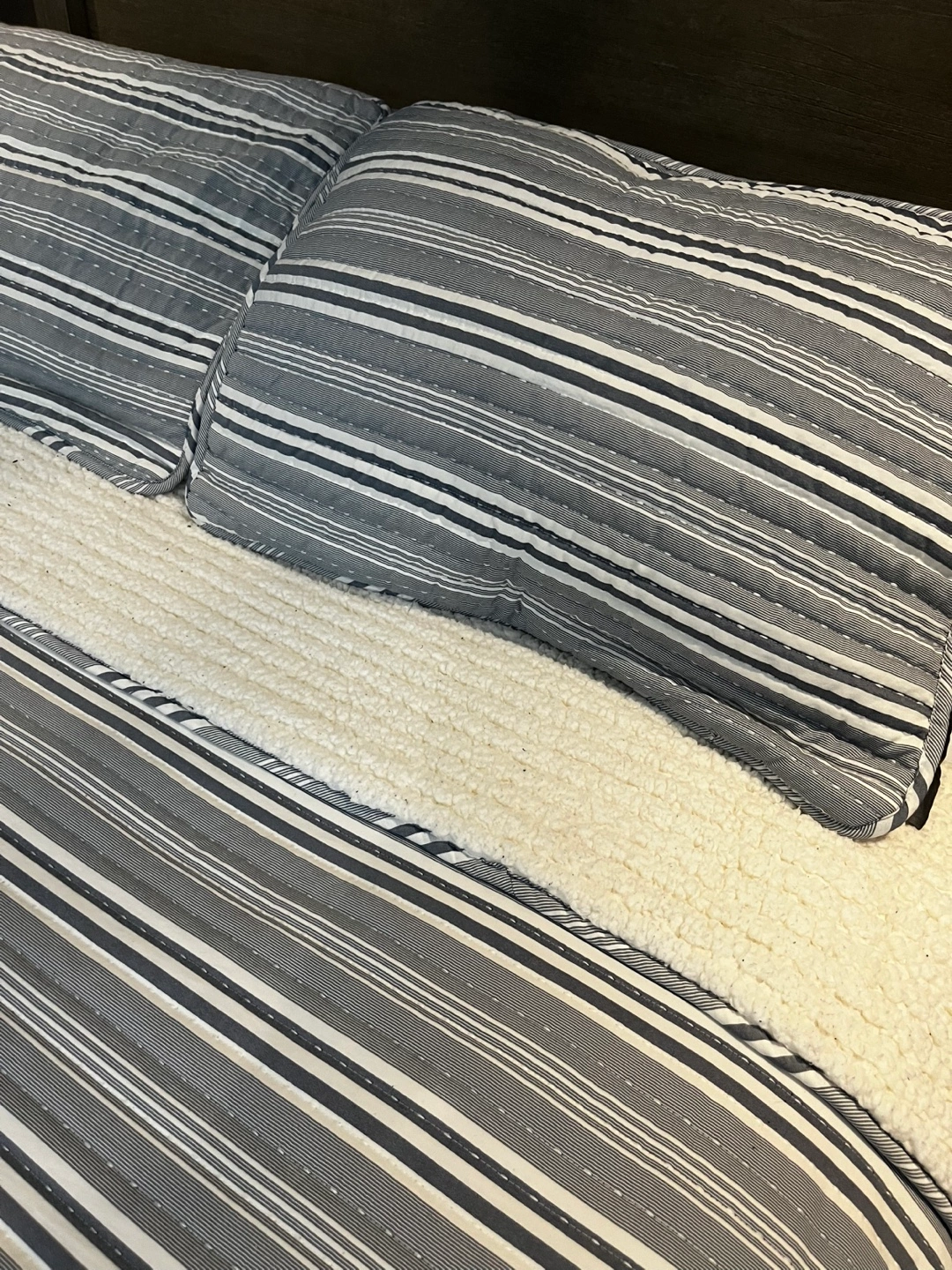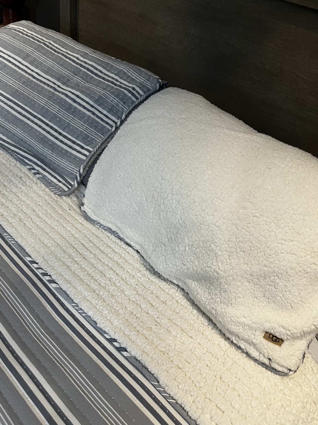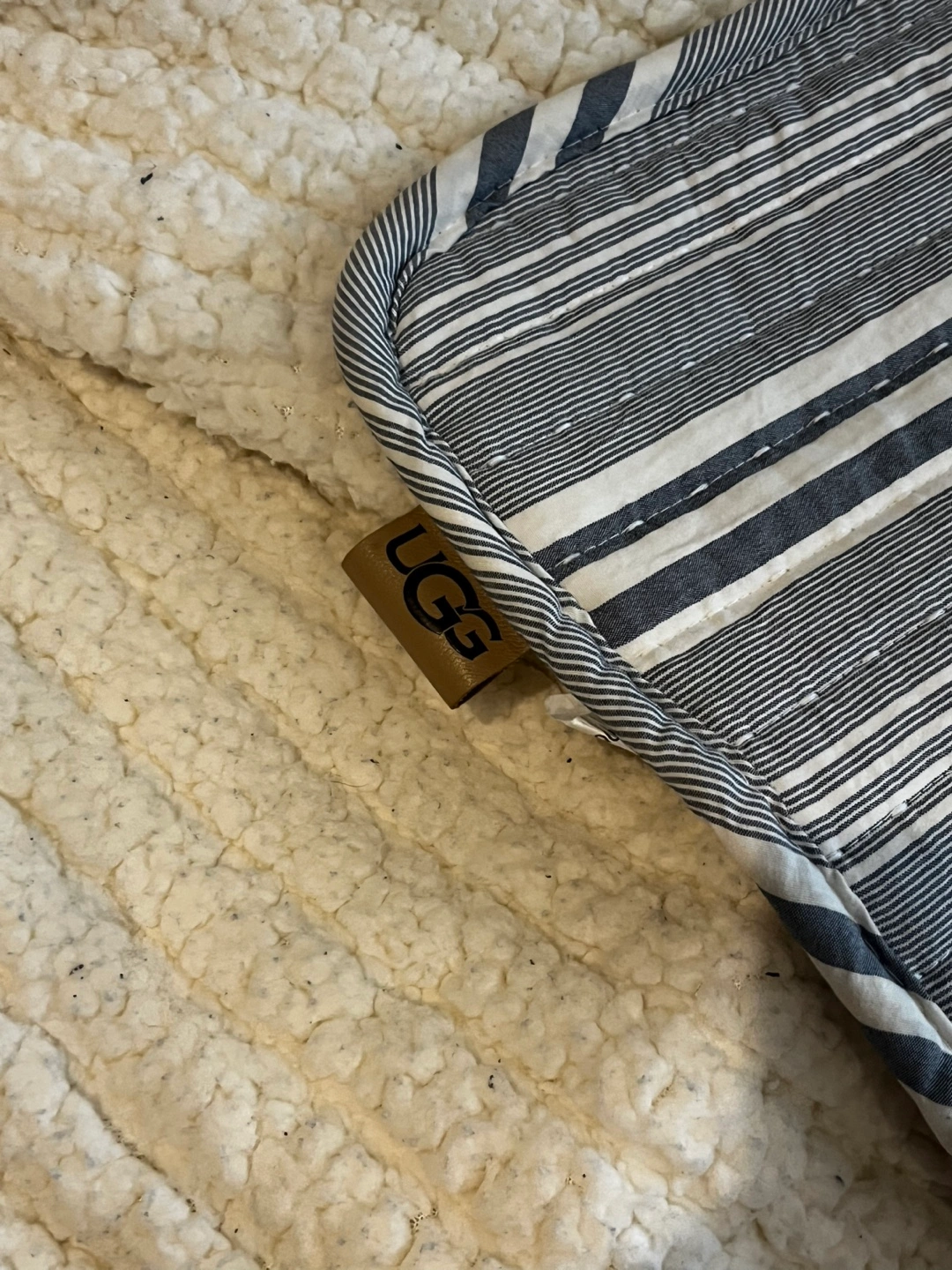 Selling an UGG comforter set with a stylish blue grey and white striped pattern. The set includes a comforter and matching pillow shams. The soft, cozy material is perfect for adding warmth and comfort to your bedroom. It's in great condition and ready for a new home!