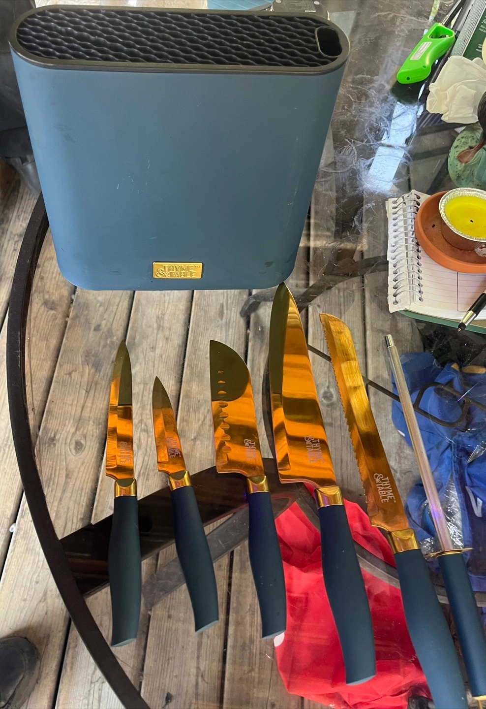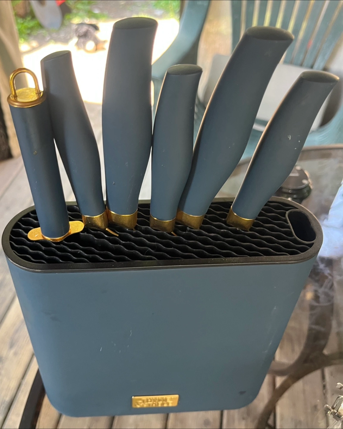58Selling a beautiful Abynse 7-piece knife set! The set features a stylish blue and gold colour scheme that will look great in any kitchen. Includes a variety of knives to meet all your cooking needs, neatly stored in a matching block. Perfect for anyone looking to upgrade their kitchen tools!
