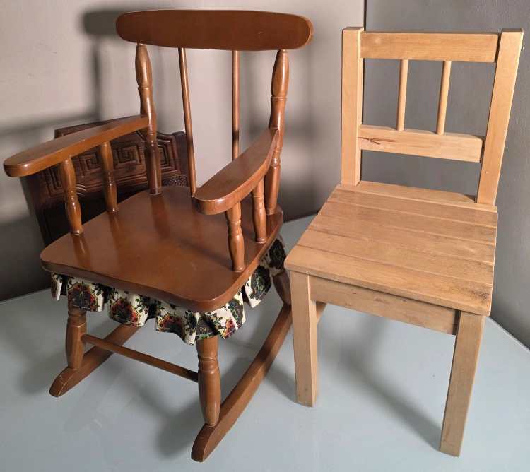 Two cute chairs for the little ones. There's a wooden rocking chair with a floral fabric detail, and another small, wooden chair. Both are in good condition and ready for a new home.