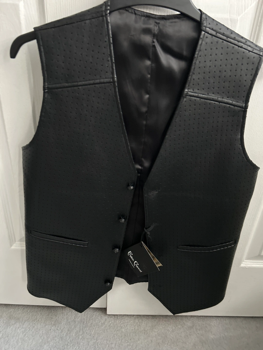 Here's a stylish black leather vest from English Channel. It features a unique perforated design and is perfect for adding a touch of edgy sophistication to any outfit. BRAND NEW with tags on