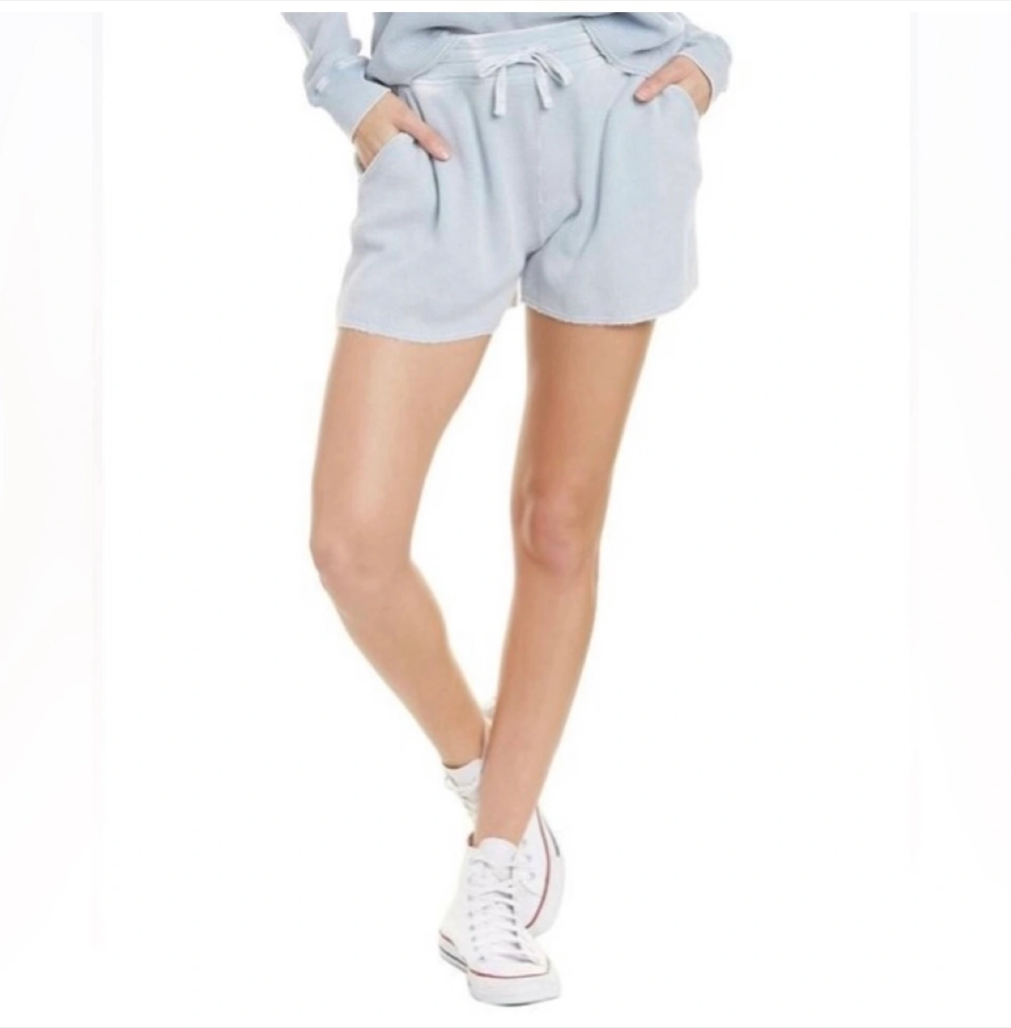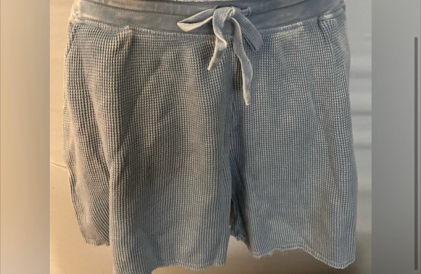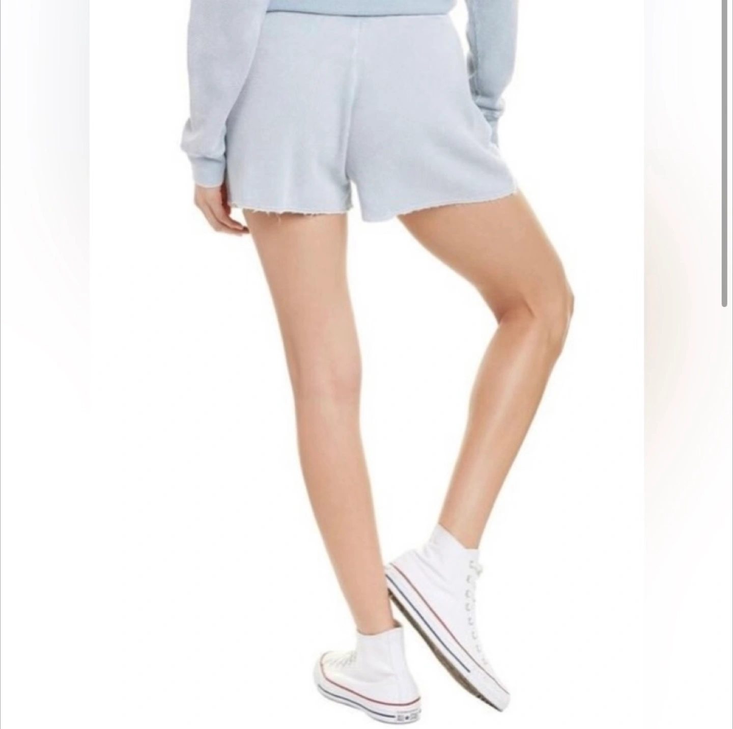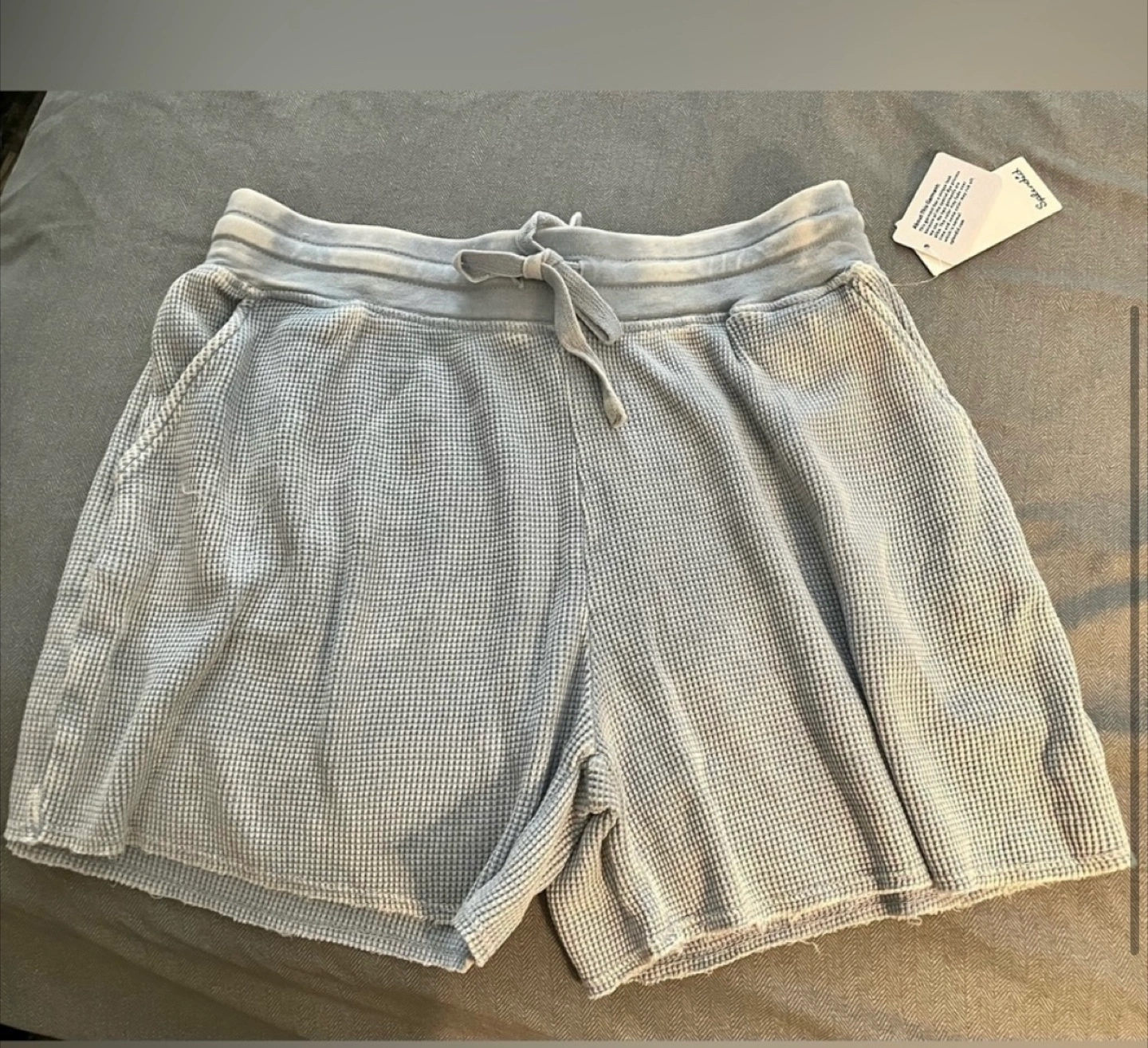 These are Splendid waffle knit shorts in a nice light blue color. They have a drawstring waist and a comfortable fit. Perfect for lounging or casual wear!