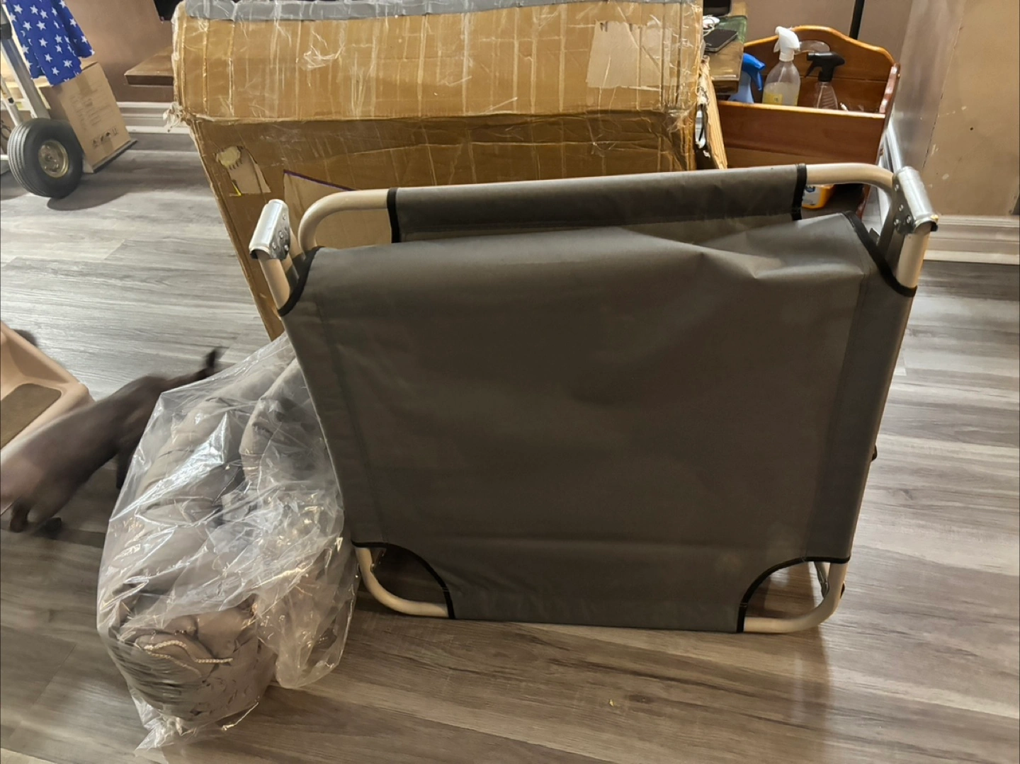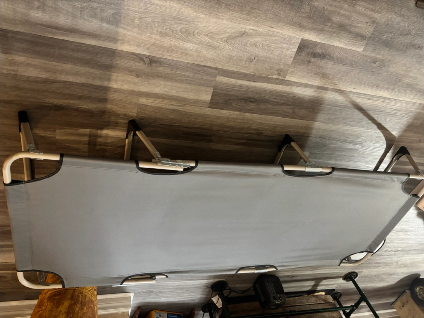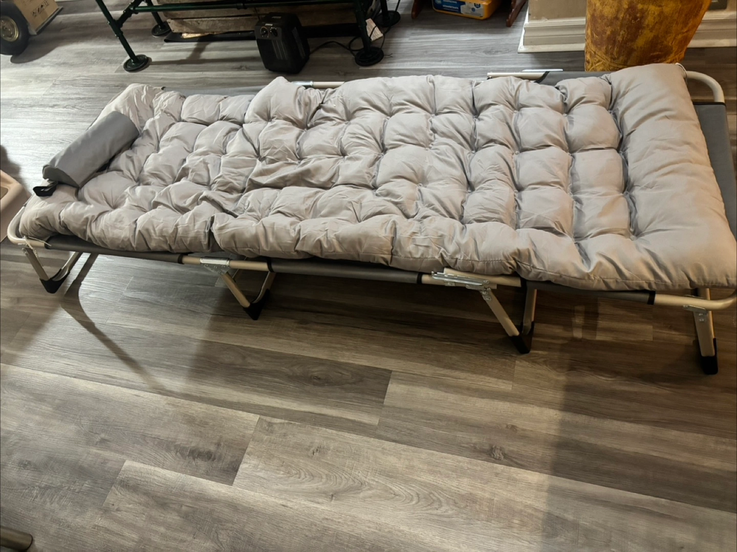 Selling a folding camping cot, perfect for camping or as an extra bed for guests! It's in great condition and comes with its original box. This cot is lightweight and portable, making it easy to transport and set up wherever you need it