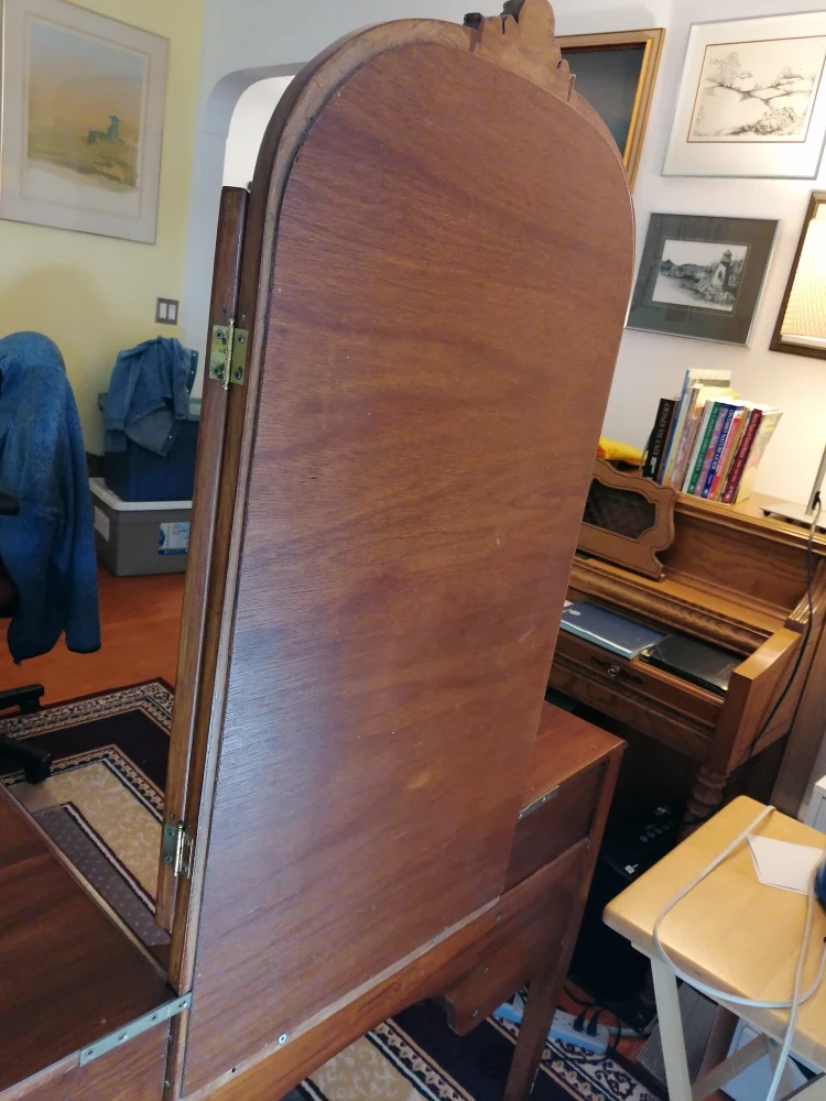 15Selling a beautiful antique vanity with a tri-fold mirror. It features a rich, dark wood finish and has drawers, 2 on either side for storage. A lovely addition to any bedroom or dressing area!