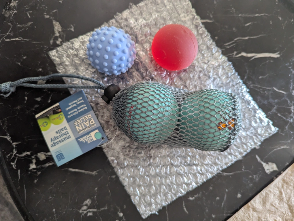 Set of massage therapy balls plus two extra, one with nibs and one squishy.