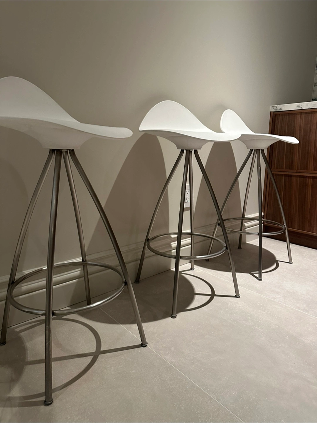Selling a set of three bar stools! They're in great condition and would look fantastic in any kitchen or bar area. The white seats are comfortable and stylish, and the metal legs are sturdy and durable. Perfect for adding some extra seating to your space