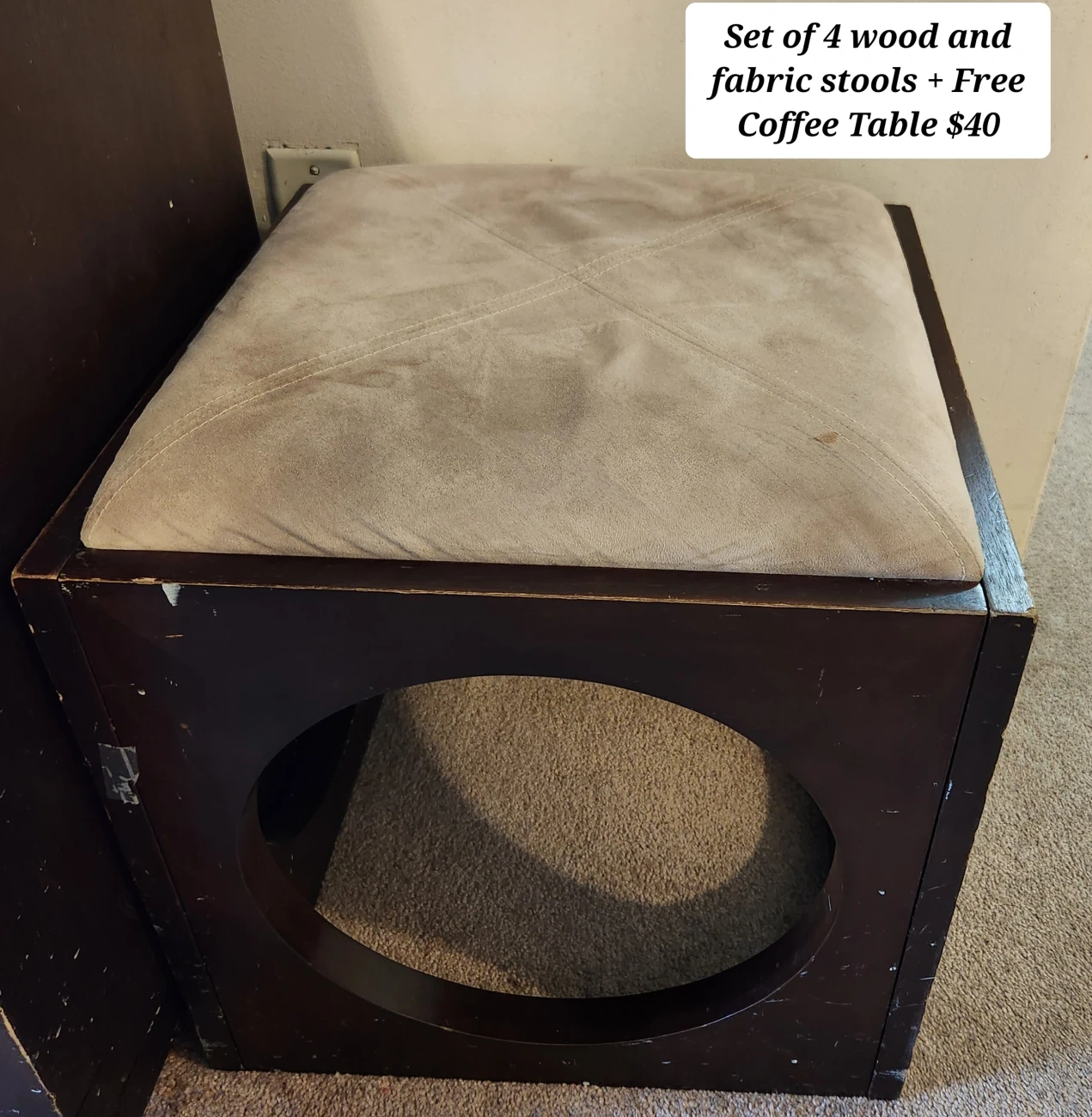 I am selling 4 wood and fabric stool and a free coffee table all for $40. The coffee table is a glass top and wood like the stools from the bottom. All 4 stools fit under it. I cant put up a picture of the coffee table as it is disassembled. The coffee table glass measures 42 inches x 42 inches. If this ad is up, it is still available. Pick up major intersection is The East Mall & Bloor St W.